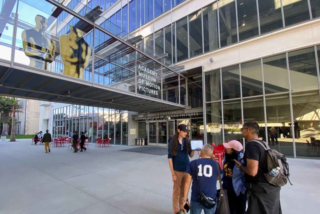 마지막으로 아카데미 영화 박물관의 입구에서 투어를 마무리합니다. 이곳에서는 영화사의 한 페이지를 체험할 수 있으며, 1939년 메이 컴퍼니 백화점으로 지어진 역사적인 스트림라인 모던 건축물을 감상할 수 있습니다.