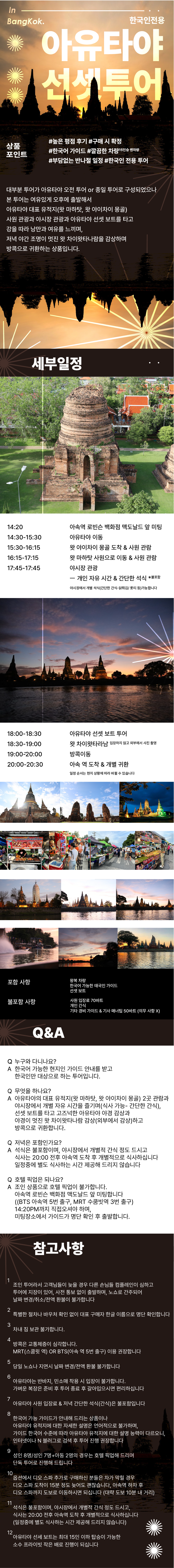 📌 [참고 사항] - 조인 투어라서 고객님들이 늦을 경우 다른 손님들 컴플레인이 심하고 투어에 지장이 있어, 사전 통보 없이 출발하며, 노쇼로 간주되어 날짜 변경/ 취소/ 전액 환불이 불가합니다. - 특별한 절차나 바우처 확인 없이 대표 구매자 한글 이름으로 명단 확인합니다. - 차 내 짐 보관 불가합니다. - 방콕은 교통 체증이 심각합니다. MRT(스쿰윗역) OR BTS(아속역 5번 출구) 이용 권장합니다. - 당일 노쇼나 지연 시 날짜 변경 및 전액 환불 불가합니다. - 아유타야는 슬리퍼나 반바지, 민소매 착용 시 입장이 불가합니다. 가벼운 복장은 준비 후 투어 종료 후 갈아입으시면 편리하십니다. - 아유타야 사원 입장료&저녁 간단한 석식(간식)은 불포함입니다. - 토요일과 일요일 예약은 월요일 13:00 전에 가능 여부 확정 드립니다. - 한국어 가능 가이드가 안내해 드리는 상품이나 아유타야 유적지에 대한 자세한 설명은 언어적으로 불가하며, 가이드 한국어 수준에 따라 아유타야 유적지에 대한 설명 능력이 다르오니, 인터넷이나 N 블로그로 검색 후 투어 진행 권장합니다. - 최소 출발 인원은 4명입니다. - 코로나로 인한 모객이 적어 최소 출발 인원이 4인입니다. 모객이 안될 경우 출발 하루 전에 고객님께 연락드리고 취소 처리해드리고 전액 환불 처리해 드립니다. - 성인 8명 / 성인 7명 + 아동 2명의 경우는 호텔 픽업해 드리며 단독 투어로 진행해 드립니다.