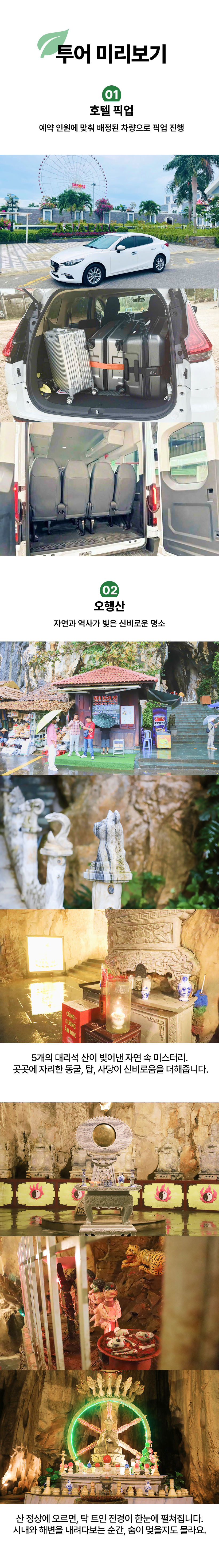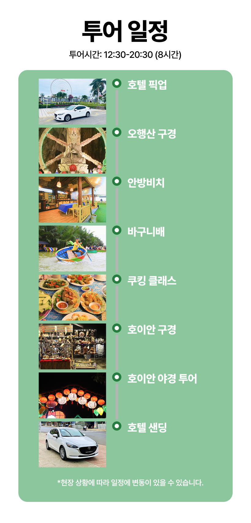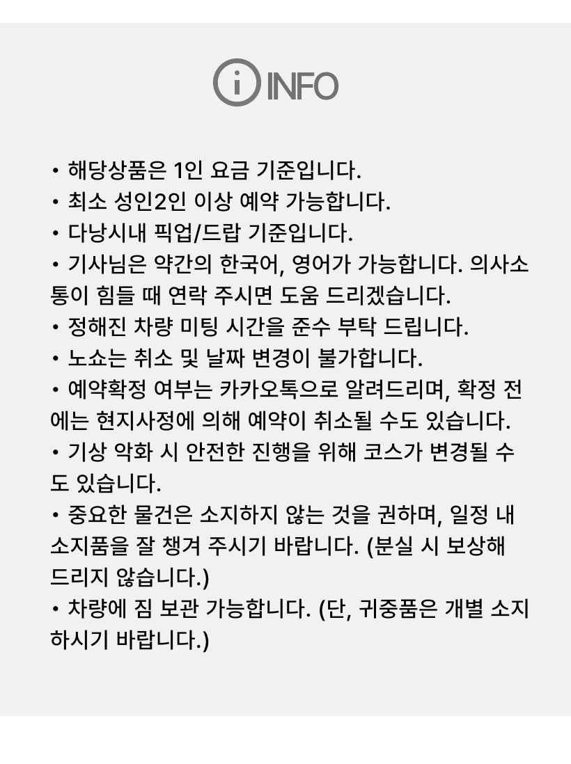 1. 운영시간 매일 12:30~20:30 (약 8시간 소요) <포함사항> • 호텔 픽업, 샌딩 • 가이드 동행(약간의 한국어, 영어 가능) • 오행산 투어 • 안방비치(커피 또는 음료 제공) • 바구니배 체험 및 공연 관람 등 • 쿠킹 클래스 체험(반쎄오, 스프링롤) 및 저녁 식사 • 호이안 올드타운 구경 <불포함사항> • 개인 경비 • 여행자보험(개별가입 권장) [주의사항] • 최소 이용가능 인원: 성인 2인 이상 • 노쇼 시 취소 및 날짜 변경 불가 • 기상악화 시 안전한 진행을 위해 코스가 변경될 수 있습니다. • 귀중품은 가급적 휴대하지 마시기를 권장 드리고, 투어 간 잘 챙겨주시기 바랍니다. (분실 또는 도난 사고 발생 시 보상이 불가합니다.) • 차량 내에 짐 보관 가능하나, 귀중품은 개인이 휴대하시기 바랍니다. • 예약확정 시 바우처 발송되며, 바우처 발송 전에는 현지 사정에 의해 취소될 수 있습니다.