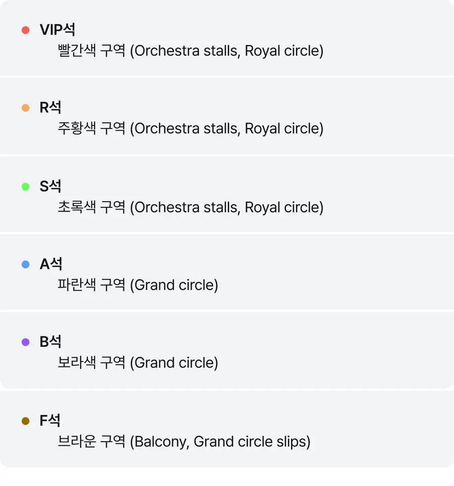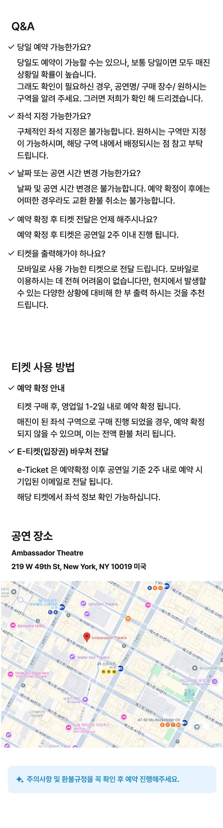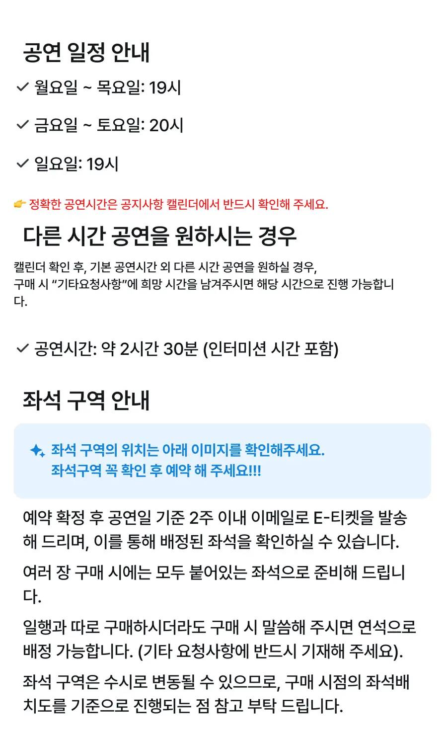 자세한 사용 방법은 바우처 내용을 반드시 확인해 주세요. 예약확정 당일 또는 영업일 1-2일 내로 E-Ticket이 이메일로 전송이 됩니다. 공연 시작 최소 30분 전까지 도착 하시는 것을 추천 드립니다. 개별 여행자 보험 가입을 권장 드립니다. 좌석 구역을 선택 하시어 결제 하시면 해당 구역 내에서 저희가 제공 드릴 수 있는 좌석 중 가장 좋은 좌석으로 배정 되십니다. 여러 장 구매 시 연석으로 배정 됩니다. 좌석 등급은 상품 이미지에서 확인 하실 수 있습니다. 결제 직후에는 어떠한 경우라도 교환/ 환불/ 취소는 불가능 합니다 (*특히, 좌석 변경 요청 및 좌석에 따른 교환/ 환불/ 취소 요청이 불가 하신 점 양해 부탁 드립니다) 📌월요일 ~ 목요일은 19시 , 금요일 ~ 토요일은 20시공연입니다. 📌일요일 19시 공연입니다. (토요일 14:30 공연 일요일 14:00 공연을 원하시는 경우, 구매시 반드시 기타 요청사항에서 알려 주셔야 합니다.) 📌일요일 공연은 시간 변동이 잦으니, 예매 전 공지사항에서 정확한 일정을 꼭 확인해주시기 바랍니다.