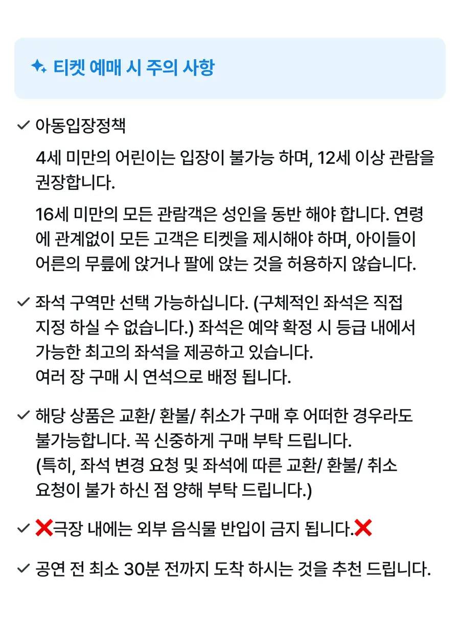 📌예약 시 위 공연시간을 기본으로 예약됩니다. (위 언급 된 시간 이외 다른 시간 공연도 구매 가능하십니다. 구매 시 요청 사항에 꼭 기재 해 주세요. 예매 전, 공지사항에 안내된 공연 일정을 꼭 확인해 주세요.) 공연 전 최소 30분 전까지 도착 하시는 것을 추천 드립니다. 16세 미만의 모든 관람객은 성인을 동반 해야 합니다. 연령에 관계없이 모든 고객은 티켓을 제시해야 하며, 아이들이 어른의 무릎에 앉거나 팔에 앉는 것을 허용하지 않습니다. 동반 청소년/ 아동과는 따로 떨어진 좌석으로 관람이 어려우니, 구매 시 꼭 청소년/아동 동반 여부 확인해 주셔야 합니다. 해당 정보가 구매 시 전달되지 않을 경우 관련 사항에 대한 도움드리기 어려운 점 유의 부탁드립니다.
