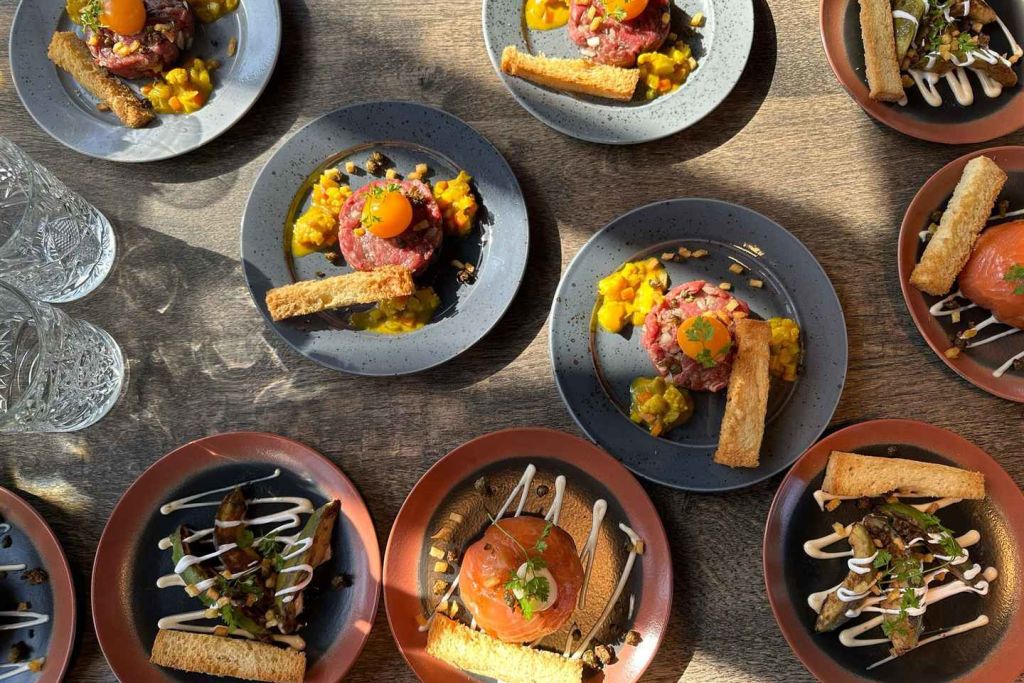 육류 메뉴: 애피타이저: 수란 노른자와 신선한 피칼릴리, 바삭한 브리오슈를 곁들인 쇠고기 타르타르