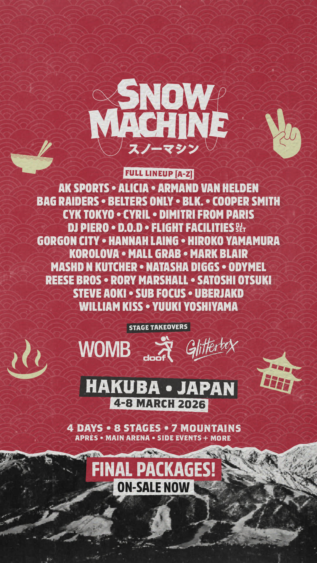 이벤트 날짜: 2026년 3월 3일 (화) – 3월 8일 (일) 장소: 일본 나가노현 하쿠바 밸리 스페셜 에디션 하이라이트: 파우더 시즌 한정 · 7개 산에 걸친 다수의 스테이지 · 논스톱 애프터 스키 파티 및 나이트 쇼 이벤트 일정: