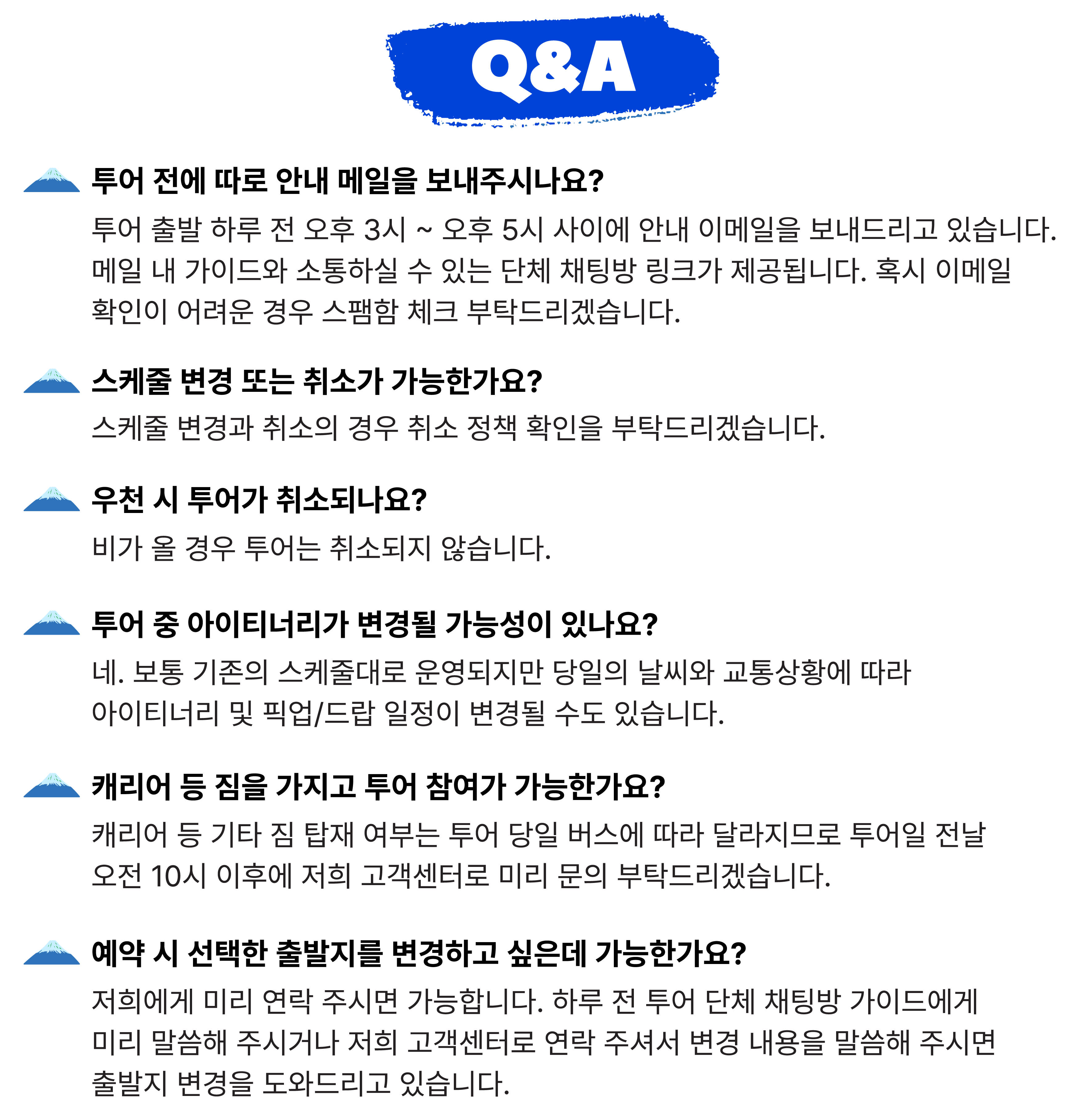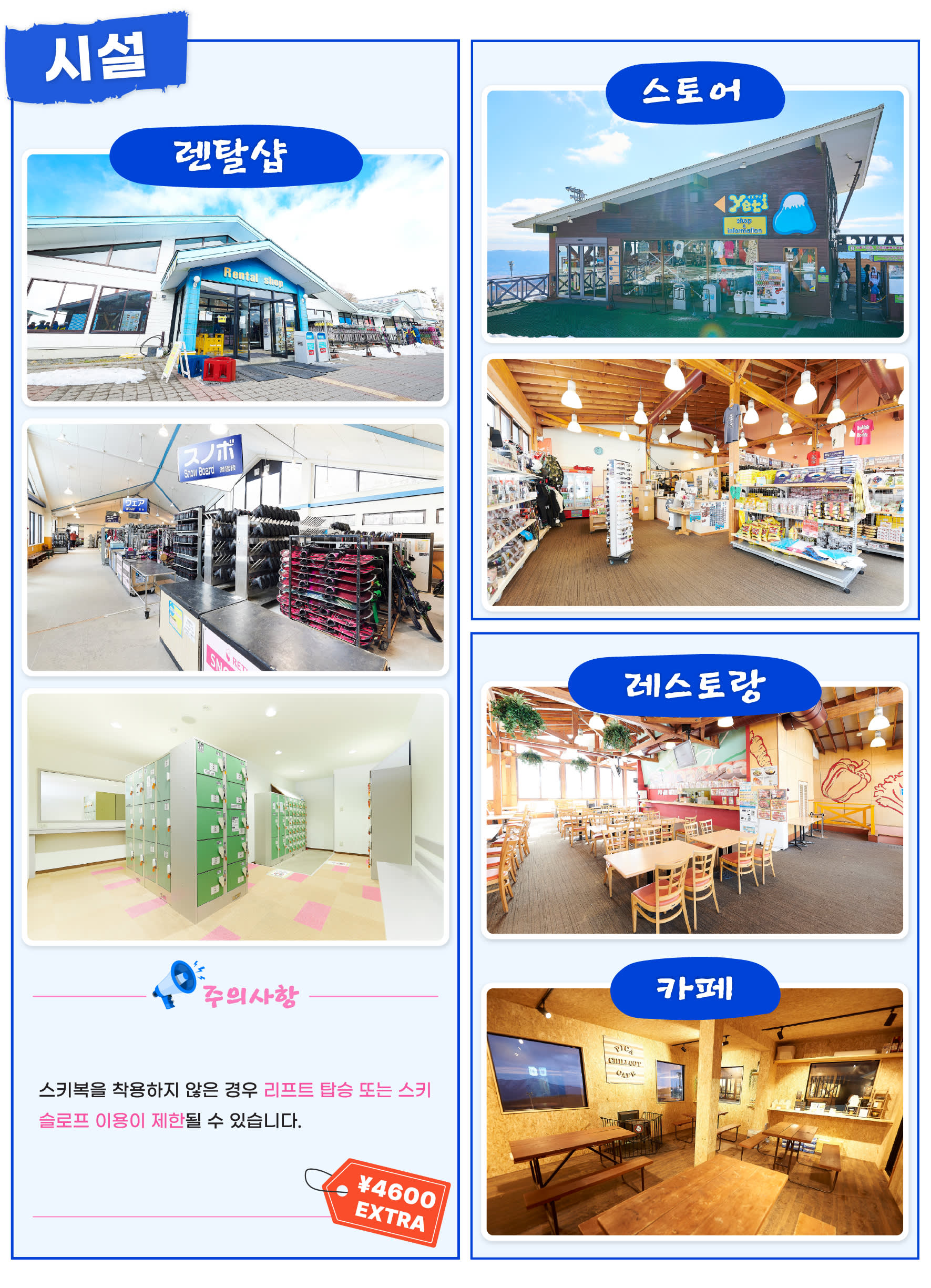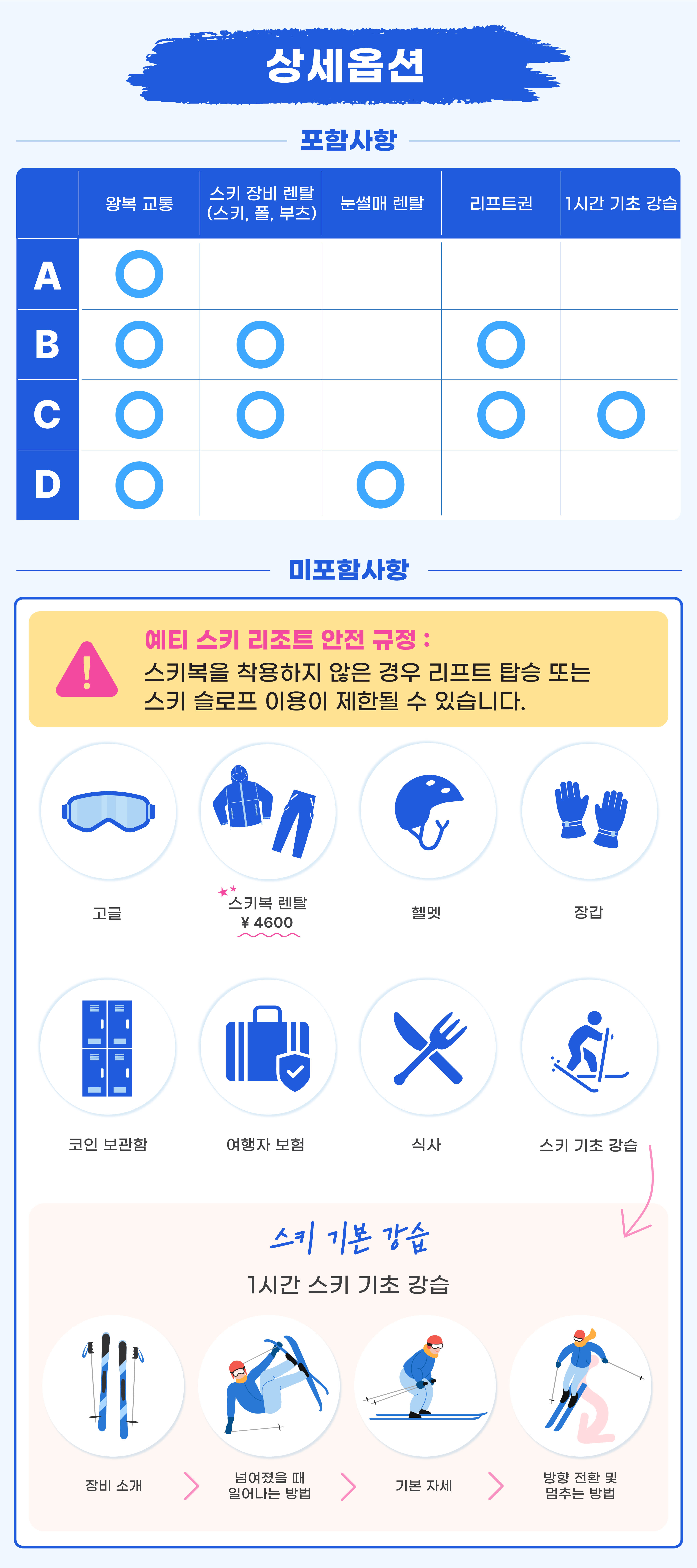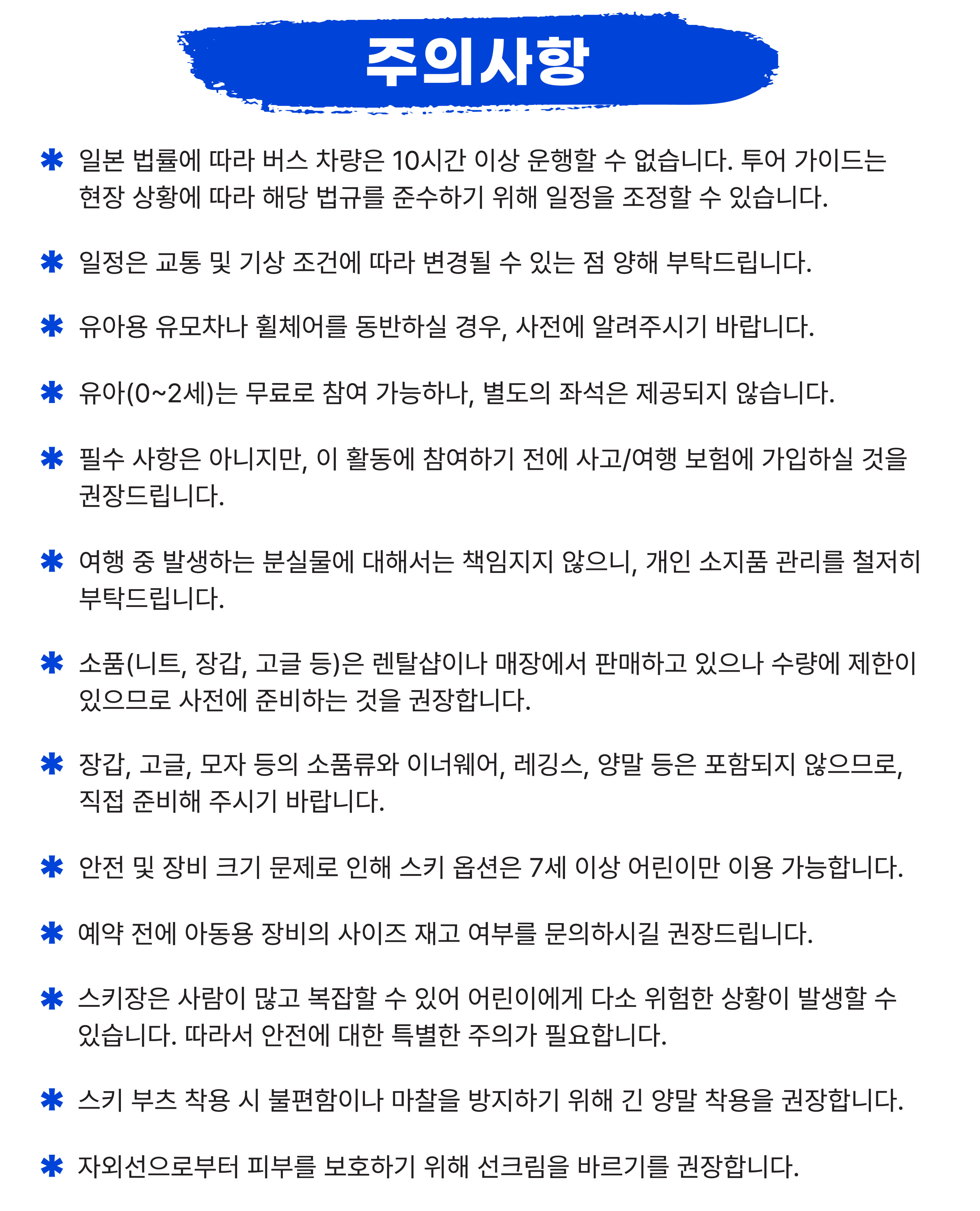 🚨예티 스키 리조트 안전 규정: 스키복을 착용하지 않은 경우 리프트 탑승 또는 스키 슬로프 이용이 제한될 수 있습니다🚨 스키복 렌탈 (상하의) : 인당 4600 엔 (선택사항이며 현장에서 현금으로 지불), 스키복 사이즈: S~5L (재고 상황에 따라 제공됩니다). 📍1시간 기본 강습에는 다음 내용이 포함됩니다. 1. 장비 소개 2. 넘어졌을 때 일어나는 방법 3. 기본 자세 4. 방향 전환 및 멈추는 방법 - 출발 10분 전까지 출발지에서 대기해 주세요. 탑승 시간에 늦으실 경우 환불이 어려운 점 양해 부탁드립니다. - 일본 법률에 따라 차량은 10시간 이상 운행할 수 없습니다. 투어 가이드는 실시간 조건에 따라 일정을 조정할 수 있습니다. - 운영 기간은 겨울 날씨 상황에 따라 변경될 수 있습니다. - 일정은 교통 및 기상 조건에 따라 변경될 수 있는 점 양해 부탁드립니다 - 유아용 유모차나 휠체어 또는 캐리어 가져오실 경우, 사전에 알려주시기 바랍니다 - 유아(0~2세)는 무료로 참여 가능하나, 별도의 좌석은 제공되지 않습니다 - 여행 중 발생하는 분실물에 대해서는 책임지지 않으니, 개인 소지품 관리를 철저히 부탁드립니다 - 소품(니트, 장갑, 고글 등)은 렌탈샵이나 매장에서 판매하고 있으나 수량에 제한이 있으므로 사전에 준비하는 것을 권장합니다 - 장갑, 고글, 모자 등의 소품류와 이너웨어, 레깅스, 양말 등은 포함되지 않으므로, 직접 준비해 주시기 바랍니다 - 안전 및 장비 크기 문제로 인해 스키 옵션은 7세 이상 어린이만 이용 가능하며, 썰매 옵션은 3세 이상부터 보호자 동반 하에 이용 가능합니다 - 예약 전에 아동용 장비의 사이즈 재고 여부를 문의하시길 권장드립니다 - 🙋♂️스키장은 사람이 많고 복잡할 수 있어 어린이에게 다소 위험한 상황이 발생할 수 있습니다. 따라서 안전에 대한 특별한 주의가 필요합니다. - 🧦스키 부츠 착용 시 불편함이나 마찰을 방지하기 위해 긴 양말 착용을 권장합니다. - ☀️자외선으로부터 피부를 보호하기 위해 선크림을 바르기를 권장합니다. - 투어 관련 변동 사항 있을 시 별도 이메일 안내 예정입니다 - 예약 인원에 따라 스타렉스 또는 버스로 운행될 수 있으며, 사전 좌석 지정은 불가능합니다 - 개인 여행자 보험은 포함되지 않으니, 필요시 꼭 별도 여행자보험 가입을 권장드립니다 [안내사항] - 본 상품은 성인 1인 이상 구매 시 이용 가능합니다. 구매 전 반드시 확인 부탁드립니다. - 소인 옵션만 구매 시 예약이 취소 처리될 수 있으며, 이 경우 재구매가 필요하니 반드시 성인 1인 이상 선택 후 결제해 주시기 바랍니다. - 대인 (만 13세 이상) - 소인 (만 3세 이상~만 12세 이하) - 유아 (만 3세 미만 유아는 무료이나, 좌석 이용이 불가능합니다)