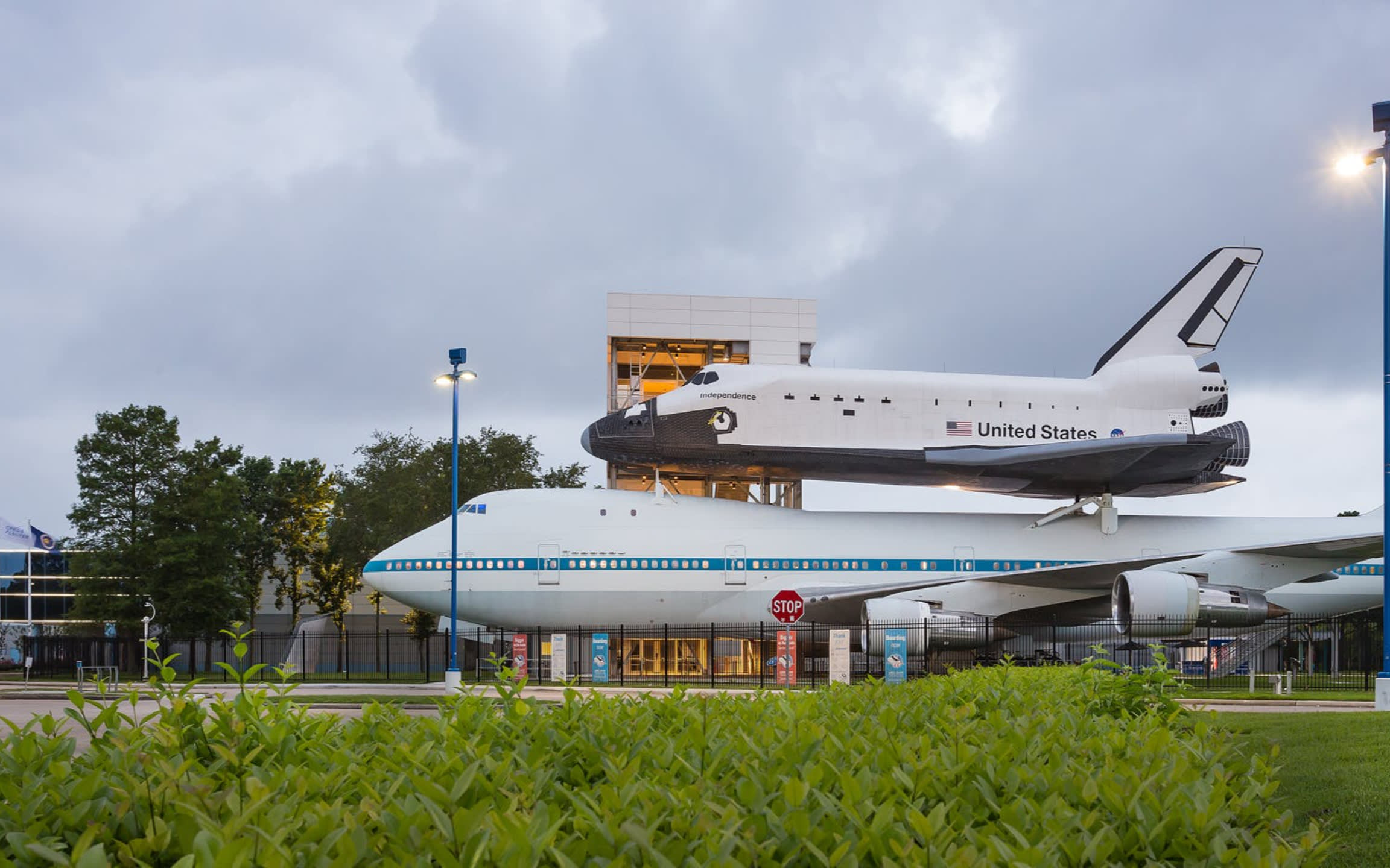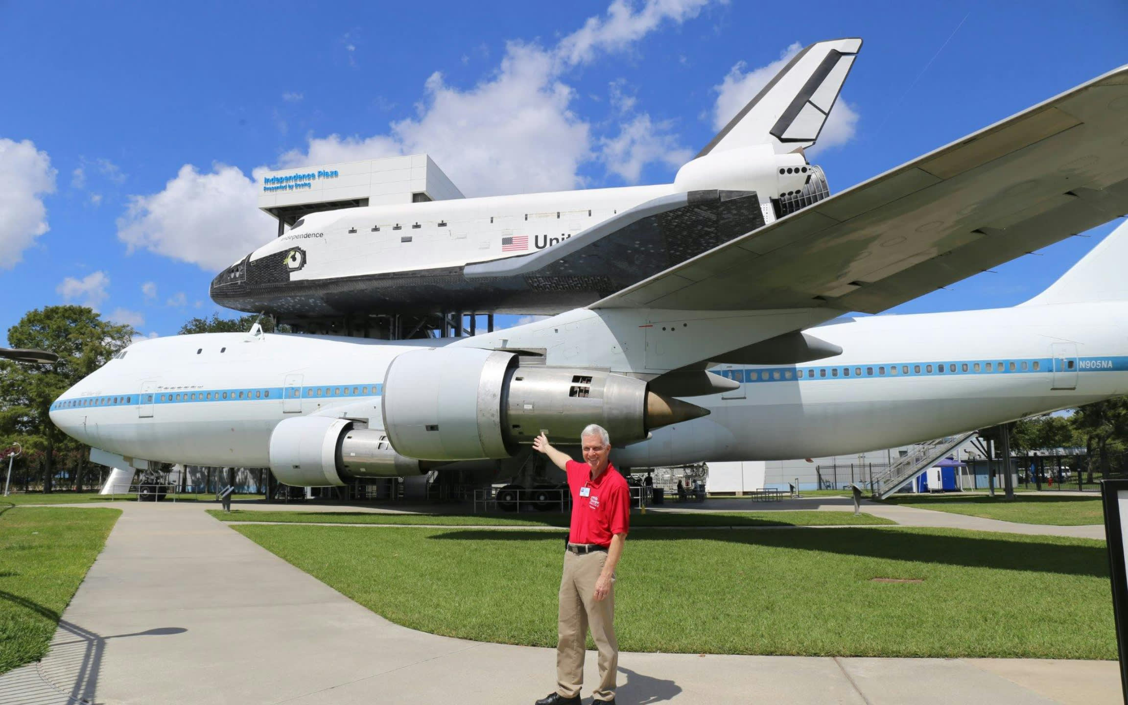 * 다양한 전시물이 있는 인디펜던스 플라자에는 NASA 905의 오리지널 우주 왕복선 운반 항공기가 있습니다.