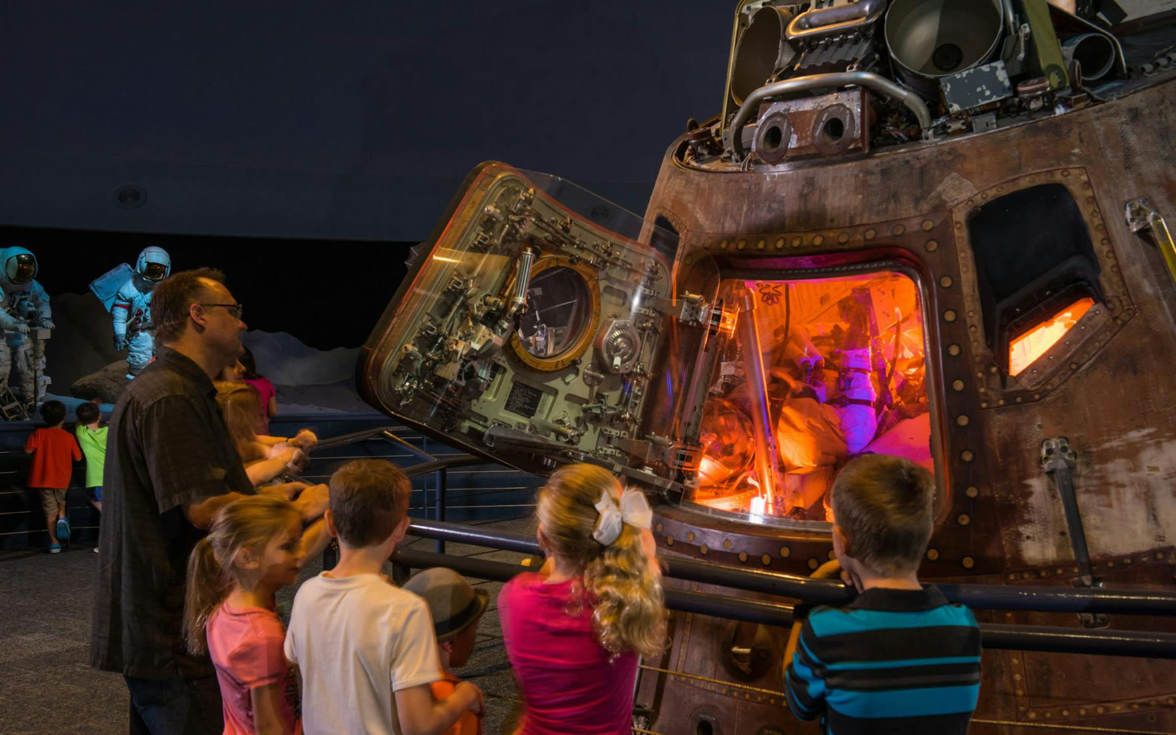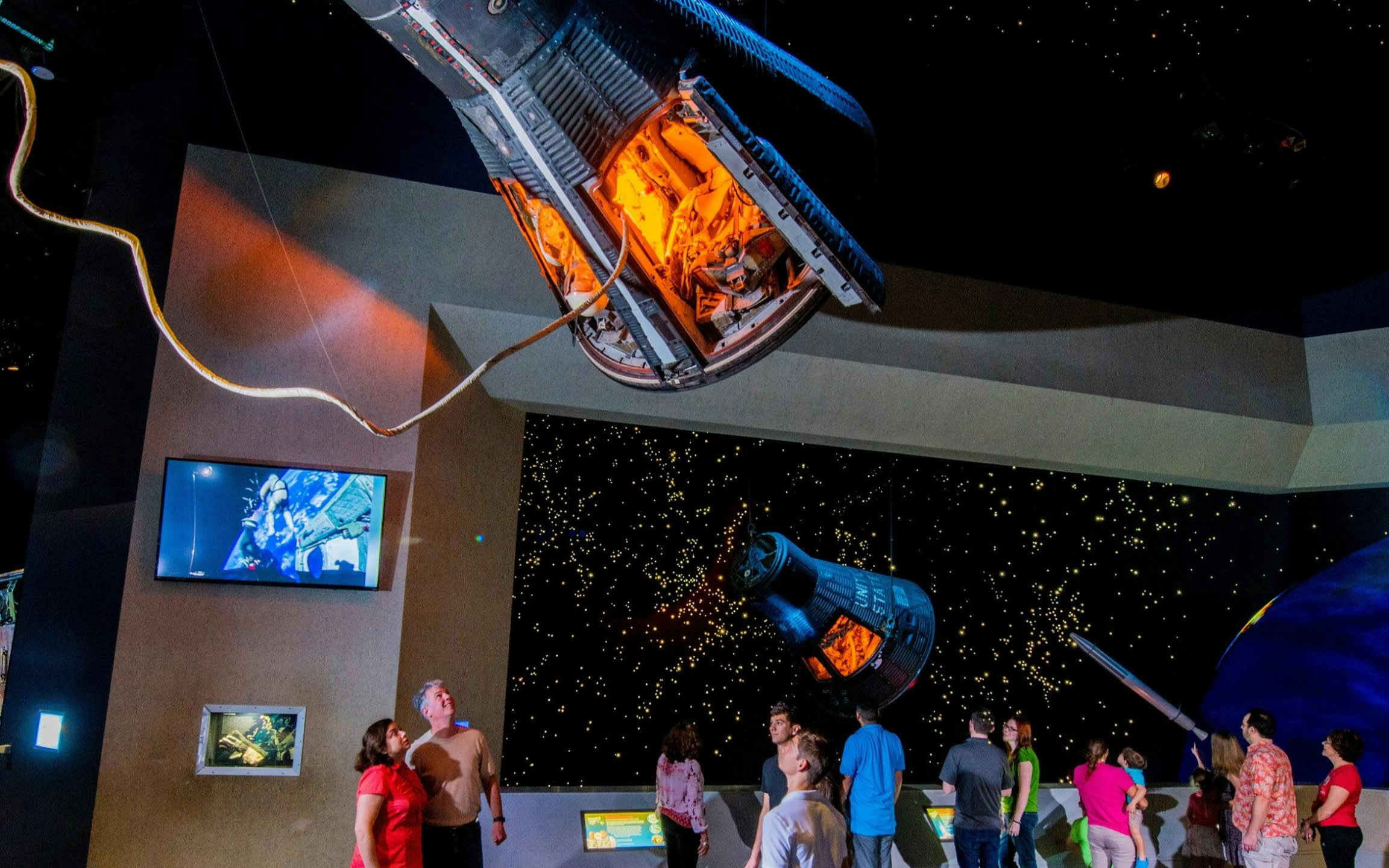 * 제미니 5, 페이스 7, 아폴로 17을 포함하여 여러 비행 우주선 가까이에 서 보세요.