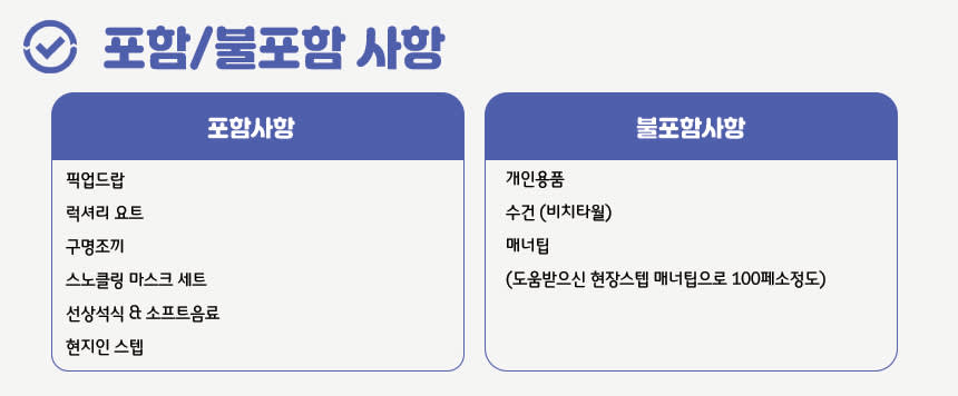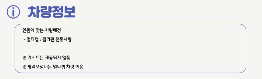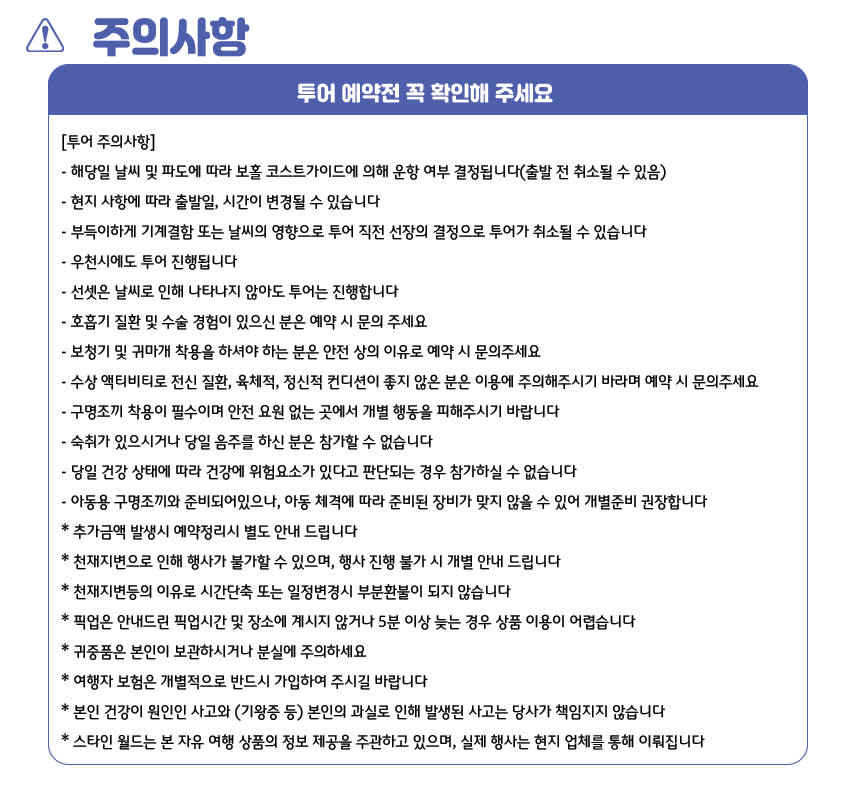 [투어 주의사항] - 해당일 날씨 및 파도에 따라 보홀 코스트가이드에 의해 운항 여부 결정됩니다(출발 전 취소될 수 있음) - 현지 사항에 따라 출발일, 시간이 변경될 수 있습니다 - 부득이하게 기계결함 또는 날씨의 영향으로 투어 직전 선장의 결정으로 투어가 취소될 수 있습니다 - 우천시에도 투어 진행됩니다 - 선셋은 날씨로 인해 나타나지 않아도 투어는 진행합니다 - 호흡기 질환 및 수술 경험이 있으신 분은 예약 시 문의 주세요 - 보청기 및 귀마개 착용을 하셔야 하는 분은 안전 상의 이유로 예약 시 문의주세요 - 수상 액티비티로 전신 질환, 육체적, 정신적 컨디션이 좋지 않은 분은 이용에 주의해주시기 바라며 예약 시 문의해주셔야 합니다 - 구명조끼 착용이 필수이며 안전 요원 없는 곳에서 개별 행동을 피해주시기 바랍니다 - 숙취가 있으시거나 당일 음주를 하신 분은 참가할 수 없습니다 - 당일 건강 상태에 따라 건강에 위험요소가 있다고 판단되는 경우 참가하실 수 없습니다 - 아동용 구명조끼와 준비되어있으나, 아동 체격에 따라 준비된 장비가 맞지 않을 수 있어 개별준비 권장합니다 * 추가금액 발생시 예약정리시 별도 안내 드립니다 * 천재지변으로 인해 행사가 불가할 수 있으며, 행사 진행 불가 시 개별 안내 드립니다 * 천재지변등의 이유로 시간단축 또는 일정변경시 부분환불이 되지 않습니다 * 픽업은 안내드린 픽업시간 및 장소에 계시지 않거나 5분 이상 늦는 경우 상품 이용이 어렵습니다 * 귀중품은 본인이 보관하시거나 분실에 주의하세요 * 여행자 보험은 개별적으로 반드시 가입하여 주시길 바랍니다 * 본인 건강이 원인인 사고와 (기왕증 등) 본인의 과실로 인해 발생된 사고는 당사가 책임지지 않습니다 * 스타인 월드는 본 자유 여행 상품의 정보 제공을 주관하고 있으며, 실제 행사는 현지 업체를 통해 이뤄집니다