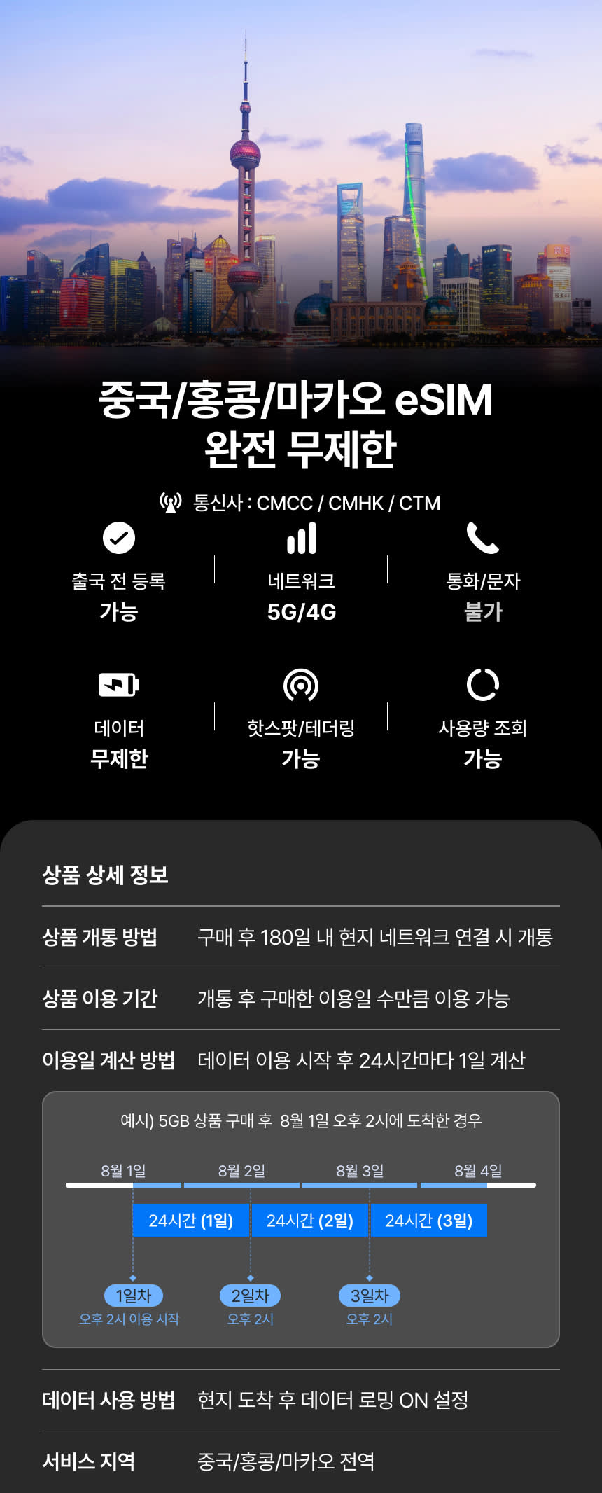 중국/홍콩/마카오 이심 eSIM 매일 완전 무제한 데이터
