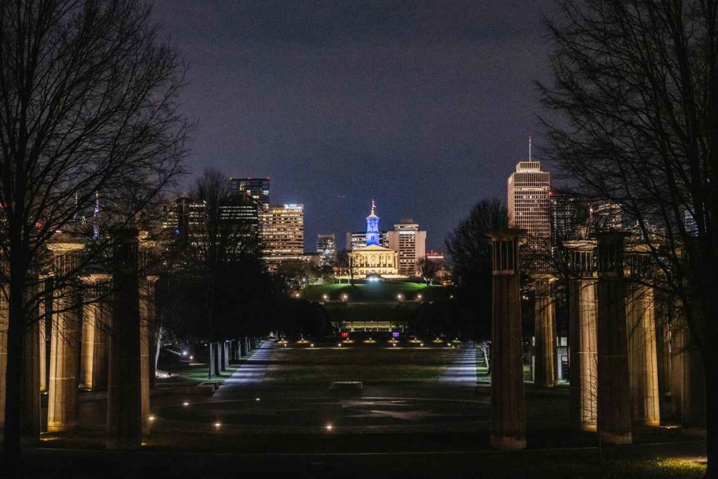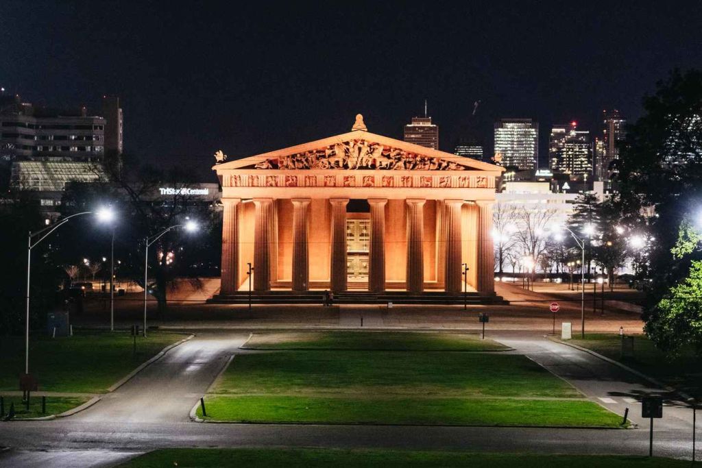 테네시 주 의사당과 파르테논 신전과 같은 랜드마크의 야간 조명을 감상하세요.