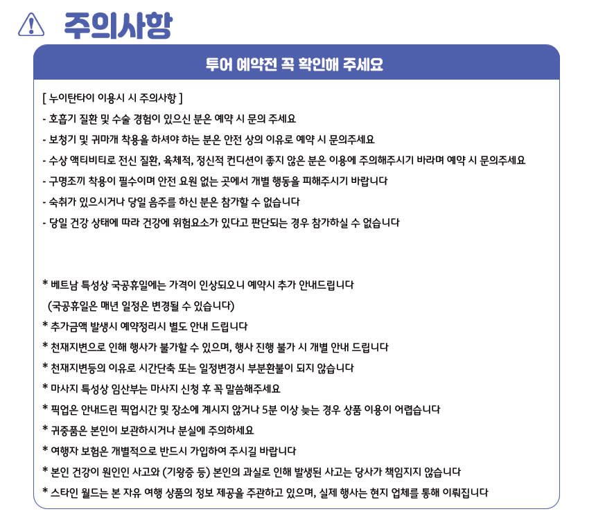 📢국공휴일 추가비용 안내 1. 베트남 특성상 하기 국공휴일에는 가격이 30% 인상되오니 예약시 해당기간 참조 부탁드립니다. 2. 매년 일정은 변경될 수 있습니다.