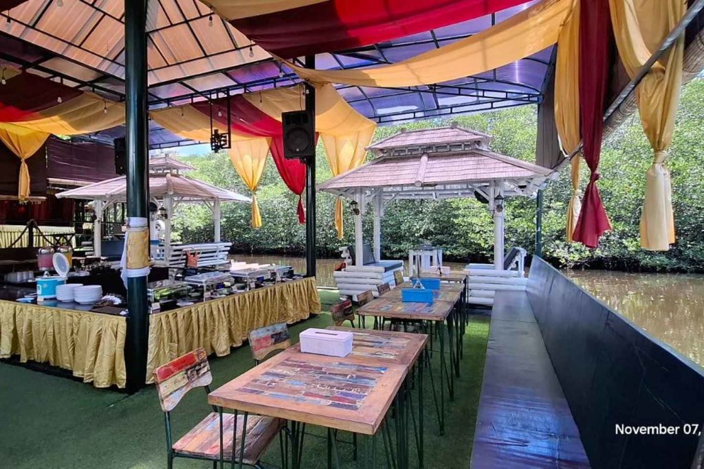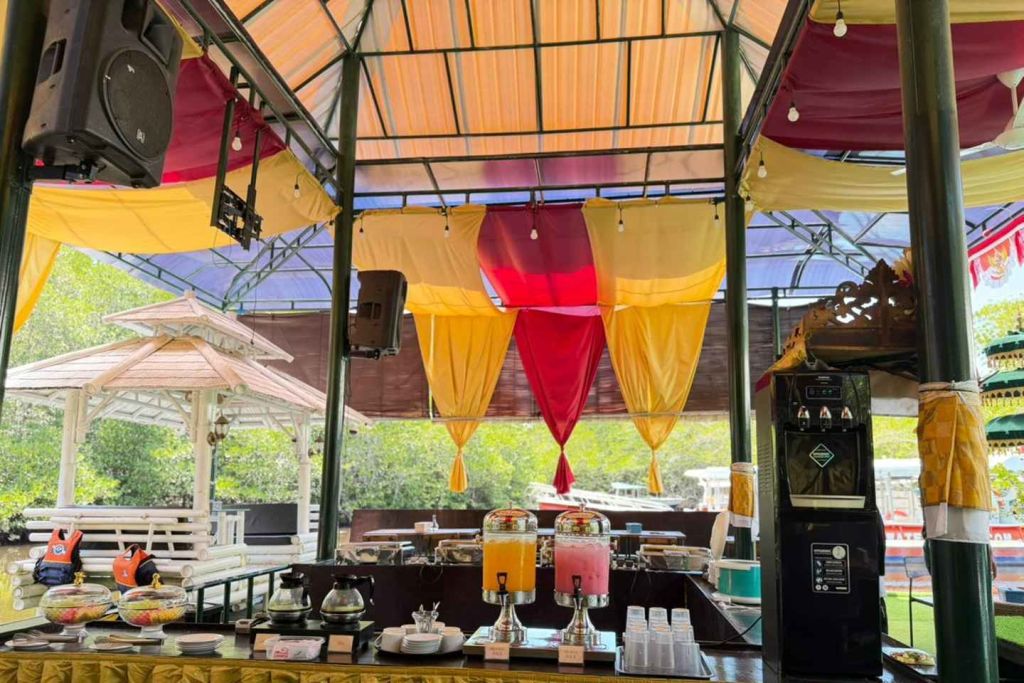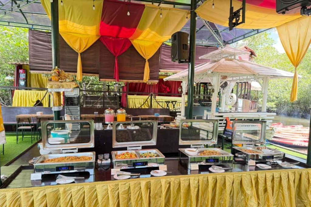 맹그로브 숲을 바라보며 맛있는 점심 뷔페를 즐기세요