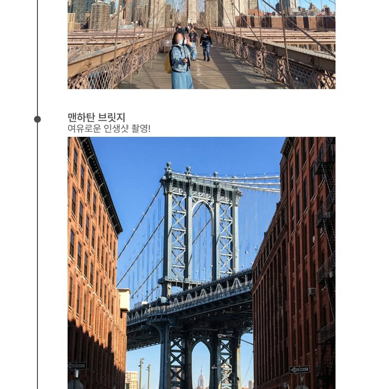 "뉴욕 시차 적응으로 일찍 눈이 떠지셨나요? 인파로 북적이기 전, 이른 아침의 정적을 깨고 브루클린 브릿지를 건너보세요. 시원한 강바람과 함께 펼쳐지는 맨하탄의 파노라마 뷰가 당신의 하루를 특별하게 시작해 줄 거예요."