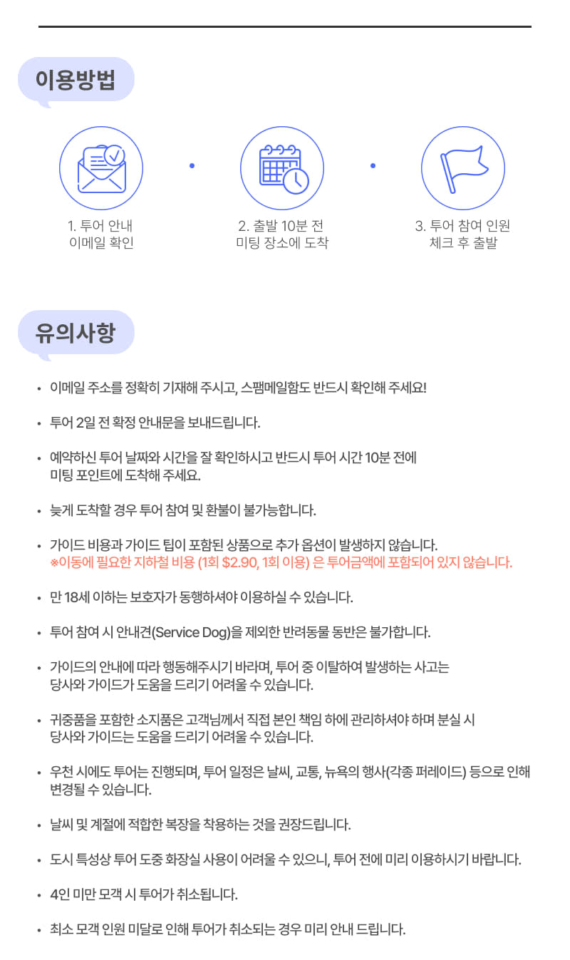 - ⚠️필수 확인 사항⚠️ * 개별 여행자 보험 가입을 권장 드립니다. * 최소 모객 인원 미만 모객시, 투어가 취소될 수 있습니다. • 이메일 주소를 정확히 기재해 주시고, 스팸메일함도 반드시 확인해 주세요! • 투어 2일 전 확정 안내문을 보내드립니다. • 예약하신 투어 날짜와 시간을 잘 확인하시고 반드시 투어 시간 10분 전에 미팅 포인트에 도착해 주세요. • 늦게 도착할 경우 투어 참여 및 환불이 불가능합니다. • 가이드 비용과 가이드 팁이 포함된 상품으로 추가 옵션이 발생하지 않습니다. ※이동에 필요한 지하철 비용 (1회 $2.90, 1회 이용) 은 투어금액에 포함되어 있지 않습니다. • 만 18세 이하는 보호자가 동행하셔야 이용하실 수 있습니다. • 투어 참여 시 안내견(Service Dog)을 제외한 반려동물 동반은 불가합니다. • 가이드의 안내에 따라 행동해주시기 바라며, 투어 중 이탈하여 발생하는 사고는 당사와 가이드가 도움을 드리기 어려울 수 있습니다. • 귀중품을 포함한 소지품은 고객님께서 직접 본인 책임 하에 관리하셔야 하며 분실 시 당사와 가이드는 도움을 드리기 어려울 수 있습니다. • 우천 시에도 투어는 진행되며, 투어 일정은 날씨, 교통, 뉴욕의 행사(각종 퍼레이드) 등으로 인해 변경될 수 있습니다. • 날씨 및 계절에 적합한 복장을 착용하는 것을 권장드립니다. • 도시 특성상 투어 도중 화장실 사용이 어려울 수 있으니, 투어 전에 미리 이용하시기 바랍니다. • 4인 미만 모객 시 투어가 취소됩니다. • 최소 모객 인원 미달로 인해 투어가 취소되는 경우 미리 안내 드립니다.