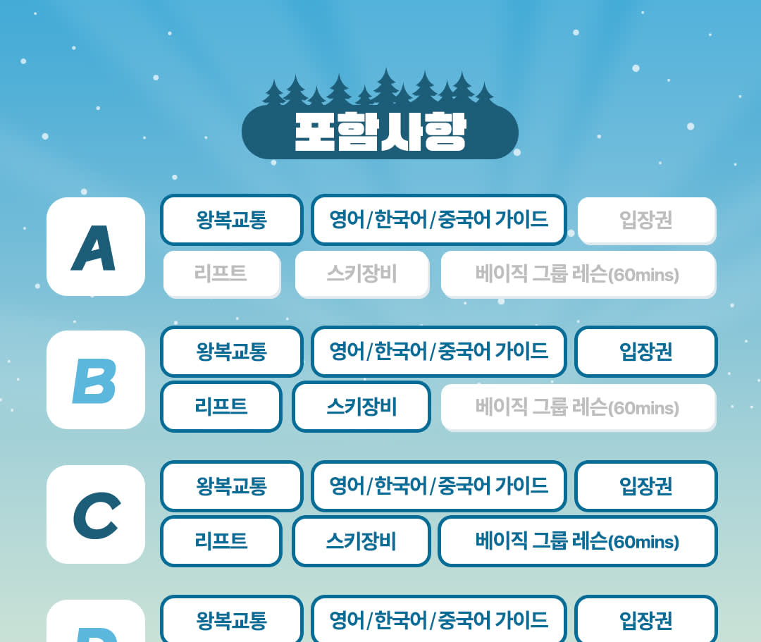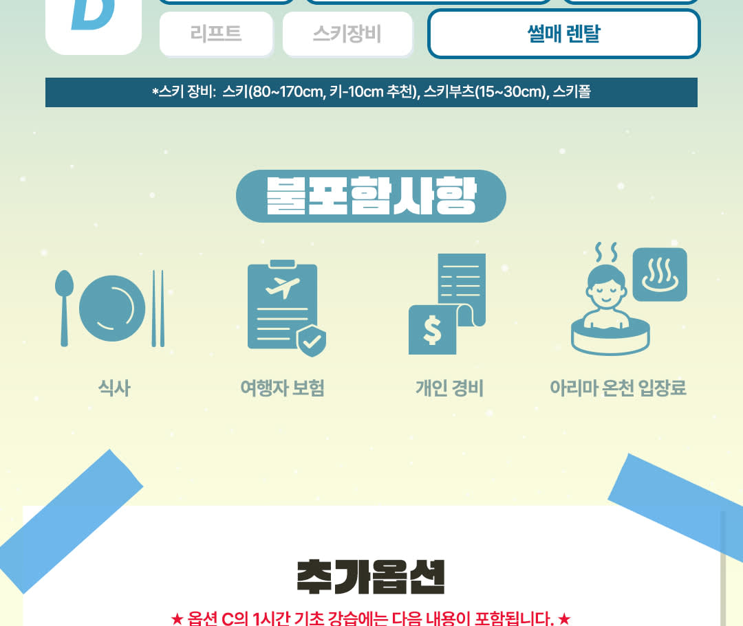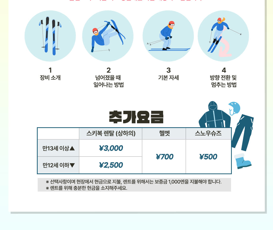 ▶C: 스키 + 강습 패키지 (입장 + 리프트 + 스키 장비 + 1시간 강습) - 이용요건 * 만 3-12세는 반드시 티켓을 소지한 성인을 동반해야 합니다. * 그룹 규모: 참여자 수 1-49인 - 추가정보 * 안전 정책: 스키 장비를 착용하지 않은 경우 스키 슬로프 이용이 금지됩니다. * 일본 법규에 따라 차량은 10시간 이상 운행할 수 없습니다. 투어 가이드가 실시간 상황에 따라 일정을 조정할 수 있습니다. * 교통 및 기상 상황에 따라 일정이 변경될 수 있습니다. * 여행 중 개인 소지품 분실에 대해서는 책임지지 않으니, 소지품 관리에 유의해 주시기 바랍니다. * 스키복은 패키지에 포함되어 있지 않으며, 현장에서 직접 대여할 수 있습니다. 대여 보증금으로 현금 1,000엔을 준비해 주세요. * 장갑, 모자, 고글 등 액세서리는 렌탈샵이나 매장에서 구매할 수 있지만, 수량이 한정적이므로 미리 준비하는 것을 추천합니다. * 장갑, 고글, 모자, 내의, 레깅스, 양말 등의 액세서리는 포함되어 있지 않으니 직접 준비해 주세요. * 따뜻하게 껴입을 수 있는 속옷을 충분히 챙겨오세요. * 예약 전 아동 장비 사이즈 이용 가능 여부를 문의하시는 것이 좋습니다. * 스키장은 붐비는 시간대에 어린이에게 위험할 수 있으니 안전에 각별히 유의하시기 바랍니다. * 스키 부츠 착용 시 불편함이나 쓸림을 방지하기 위해 긴 양말을 착용하는 것이 좋습니다. * 자외선으로부터 피부를 보호하기 위해 자외선 차단제를 가져와서 바르는 것이 좋습니다. * 여행객은 어느 정도의 체력이 필요합니다. 투어 참여에 적합한 건강 상태인지 확인해주세요. * 스키는 체력을 많이 소모하는 활동이므로, 유아, 임산부, 노약자에게는 권장하지 않습니다. * 스키는 격렬하고 잠재적으로 위험한 스포츠입니다. 여행자 보험은 투어에 포함되어 있지 않으므로, 출발 전 여행자 보험이나 상해 보험에 가입하시는 것을 권장합니다. * 안전상의 이유로 스키장 내에서는 장비를 들고 슬로프를 걸어 올라가는 것이 금지되어 있습니다. * 온천 이용 시, 문신이 있는 분은 스티커나 테이프로 문신을 가려야 합니다. 그렇지 않으면 입장이 불가합니다. * 혼잡도에 따라 아리 온천의 입장 및 이용이 제한될 수 있습니다. * 만취한 여행객은 온천 이용이 거부될 수 있습니다. * 전염병이 있는 여행객은 시설 입장이 불가합니다. 온천 이용은 심장 질환이 있는 고객의 건강에 해로울 수 있으니 유의하시기 바랍니다. - 규정 및 제한사항 * 거동이 불편하신 분에게는 본 액티비티를 권장하지 않습니다. * 임신부에게는 본 액티비티를 권장하지 않습니다. * 본 액티비티는 고혈압, 간질 등의 의학적 질환을 앓고 계신 분에게는 권장하지 않습니다. - 준비물 * 속옷, 레깅스, 양말 - 편의성/접근성 * 유모차 이용이 가능합니다. * 휠체어 이용이 불가합니다. - 차량 & 수하물 정보 * 탑승 가능 인원수: 49인 (운전기사 제외)