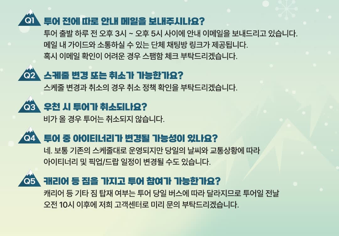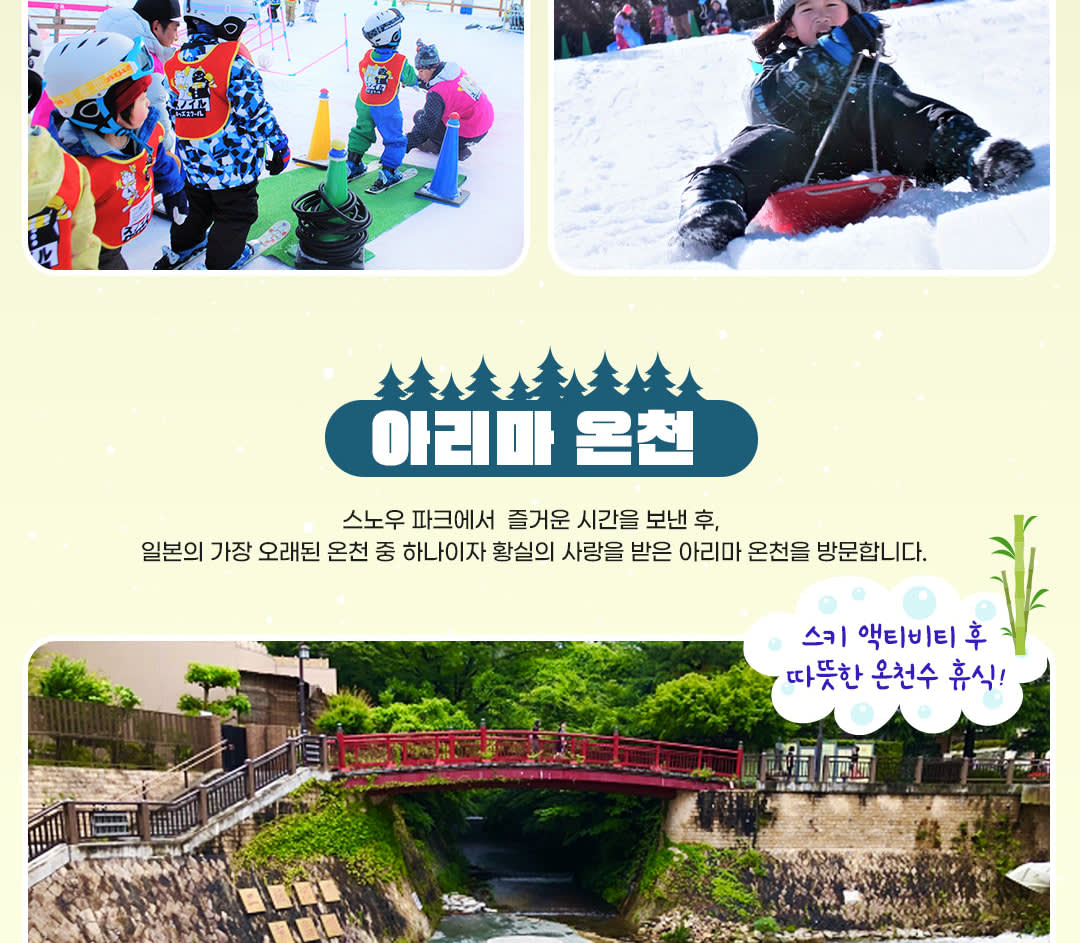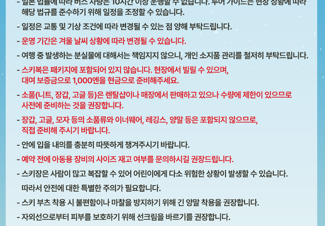 ▶D: 설매 & 스노우 펀 패키지 (입장 + 설매) - 이용요건 * 본 상품은 이용 가능 연령이 제한되어 있지 않습니다. * 만 0-2세는 별도의 좌석이 필요하지 않은 경우 무료입니다. * 그룹 규모: 참여자 수 1-49인 - 추가정보 * 안전 정책: 스키 장비를 착용하지 않은 경우 스키 슬로프 이용이 금지됩니다. * 일본 법규에 따라 차량은 10시간 이상 운행할 수 없습니다. 투어 가이드가 실시간 상황에 따라 일정을 조정할 수 있습니다. * 교통 및 기상 상황에 따라 일정이 변경될 수 있습니다. * 여행 중 개인 소지품 분실에 대해서는 책임지지 않으니, 소지품 관리에 유의해 주시기 바랍니다. * 스키복은 패키지에 포함되어 있지 않으며, 현장에서 직접 대여할 수 있습니다. 대여 보증금으로 현금 1,000엔을 준비해 주세요. * 장갑, 모자, 고글 등 액세서리는 렌탈샵이나 매장에서 구매할 수 있지만, 수량이 한정적이므로 미리 준비하는 것을 추천합니다. * 장갑, 고글, 모자, 내의, 레깅스, 양말 등의 액세서리는 포함되어 있지 않으니 직접 준비해 주세요. * 따뜻하게 껴입을 수 있는 속옷을 충분히 챙겨오세요. * 예약 전 아동 장비 사이즈 이용 가능 여부를 문의하시는 것이 좋습니다. * 스키장은 붐비는 시간대에 어린이에게 위험할 수 있으니 안전에 각별히 유의하시기 바랍니다. * 스키 부츠 착용 시 불편함이나 쓸림을 방지하기 위해 긴 양말을 착용하는 것이 좋습니다. * 자외선으로부터 피부를 보호하기 위해 자외선 차단제를 가져와서 바르는 것이 좋습니다. * 여행객은 어느 정도의 체력이 필요합니다. 투어 참여에 적합한 건강 상태인지 확인해주세요. * 안전상의 이유로 스키장 내에서는 장비를 들고 슬로프를 걸어 올라가는 것이 금지되어 있습니다. * 온천 이용 시, 문신이 있는 분은 스티커나 테이프로 문신을 가려야 합니다. 그렇지 않으면 입장이 불가합니다. * 혼잡도에 따라 아리 온천의 입장 및 이용이 제한될 수 있습니다. * 만취한 여행객은 온천 이용이 거부될 수 있습니다. * 전염병이 있는 여행객은 시설 입장이 불가합니다. 온천 이용은 심장 질환이 있는 고객의 건강에 해로울 수 있으니 유의하시기 바랍니다. - 준비물 * 속옷, 레깅스, 긴 양말 - 편의성/접근성 * 유모차 이용이 가능합니다. * 휠체어 이용이 불가합니다. - 차량 & 수하물 정보 * 탑승 가능 인원수: 49인 (운전기사 제외)