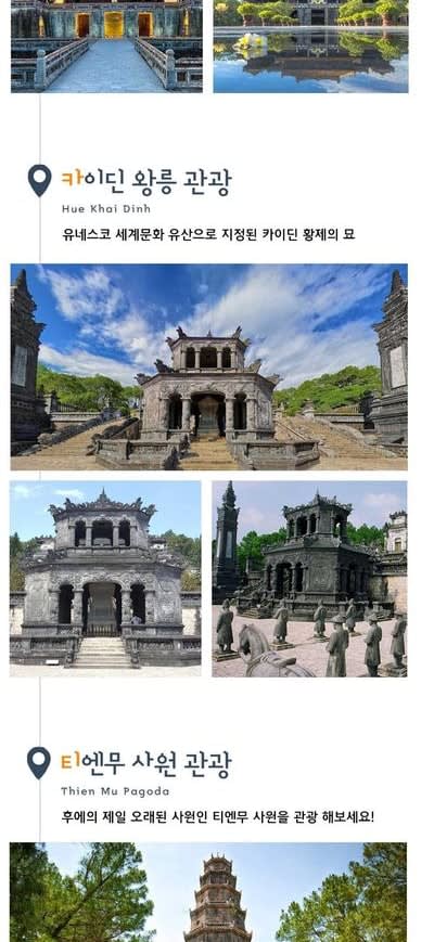 * 후에 왕궁, 카이딘 황제의 왕릉, 티엔무 사원 등 역사적인 명소를 둘러볼 수 있습니다.