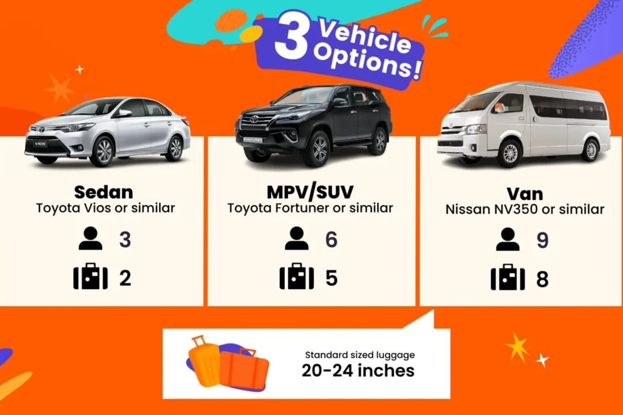 - 차량 정보 * 스탠다드 세단 * 차량 모델: 토요타 비오스 또는 유사 차종 * 스탠다드 MPV * 차량 모델: 토요타 이노바 또는 유사 차량 * 스탠다드 밴 * 차량 모델: 닛산 NV350 또는 유사 차량