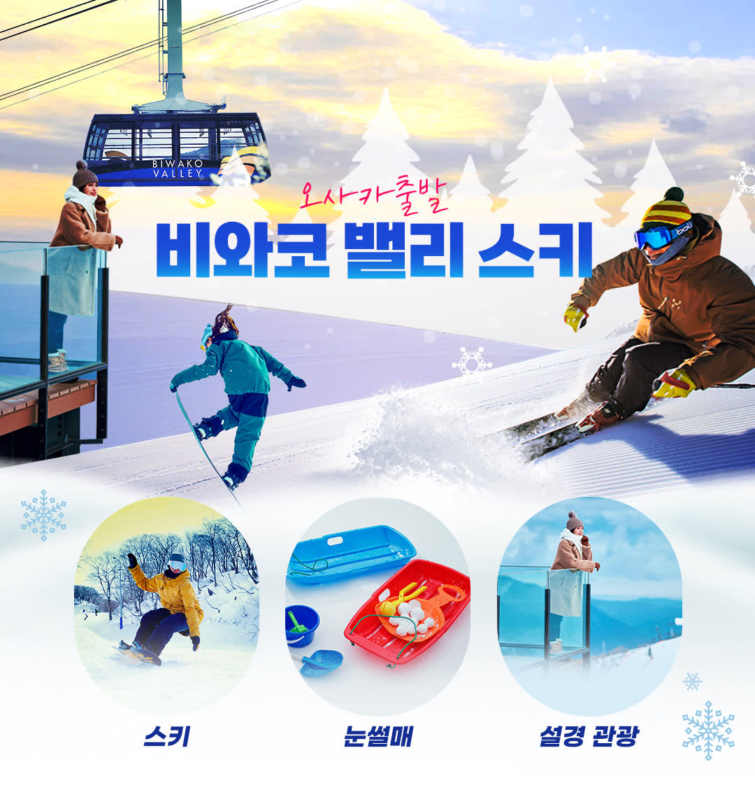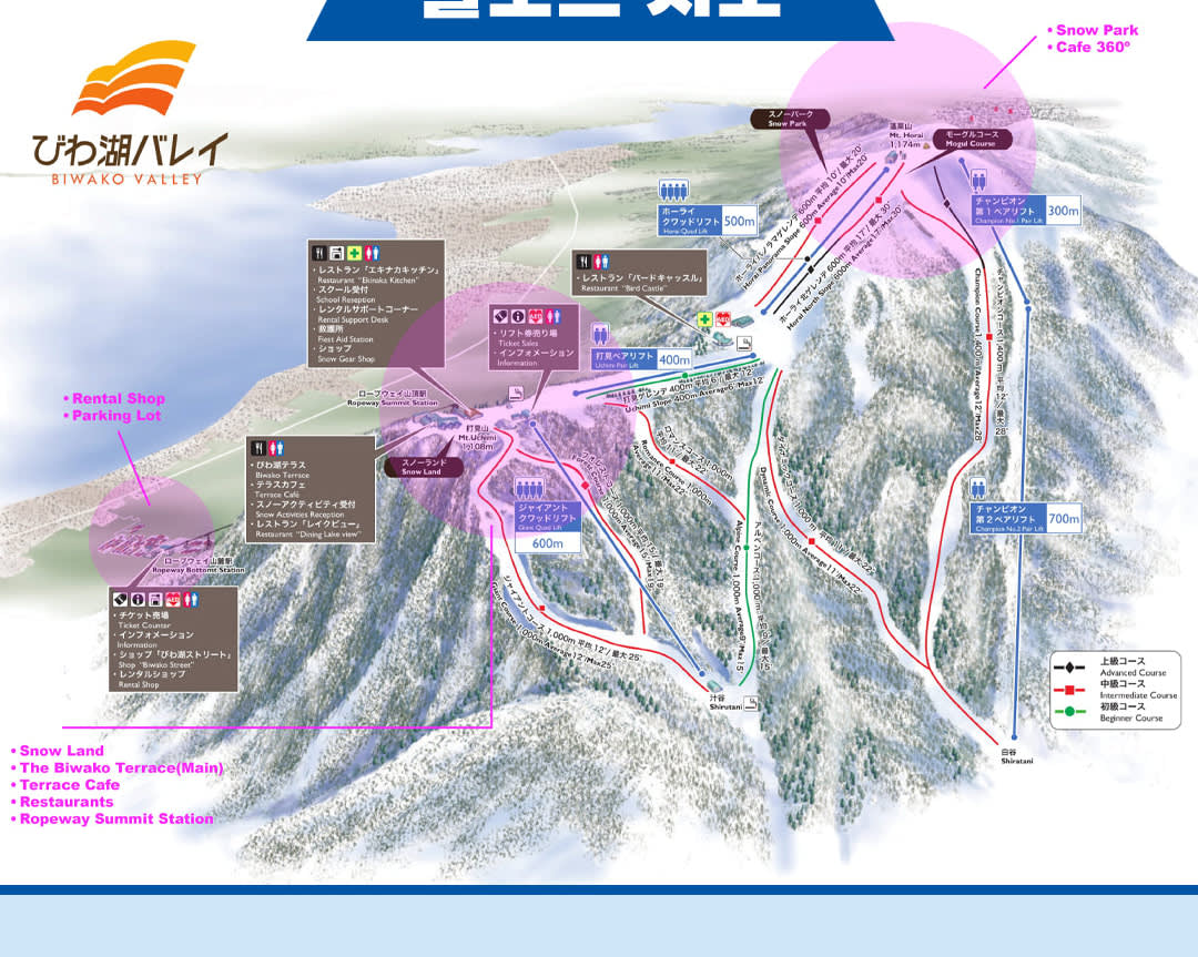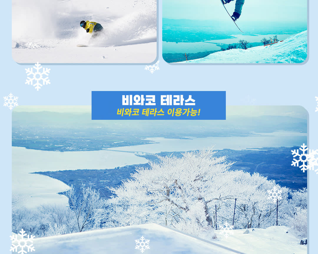 모두를 위한 여행지입니다.스릴을 즐기는 분들은 다양한 코스를 정복하고, 가족 단위 여행객은 안전하고 재미있는 눈썰매를 즐길 수 있는 스노우 랜드에서 즐거운 추억을 만들 수 있습니다. 스키를 타지 않으신다고요?유명한 비와코 테라스까지 운행하는 아름다운 곤돌라를 타고 올라가면 그 자체로도 훌륭한 관광 명소인 숨 막힐 듯 아름다운 사진을 찍을 수 있습니다.
