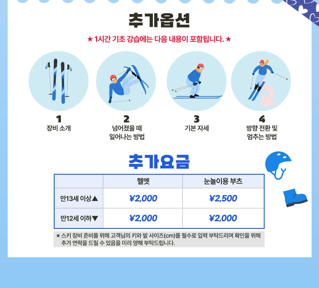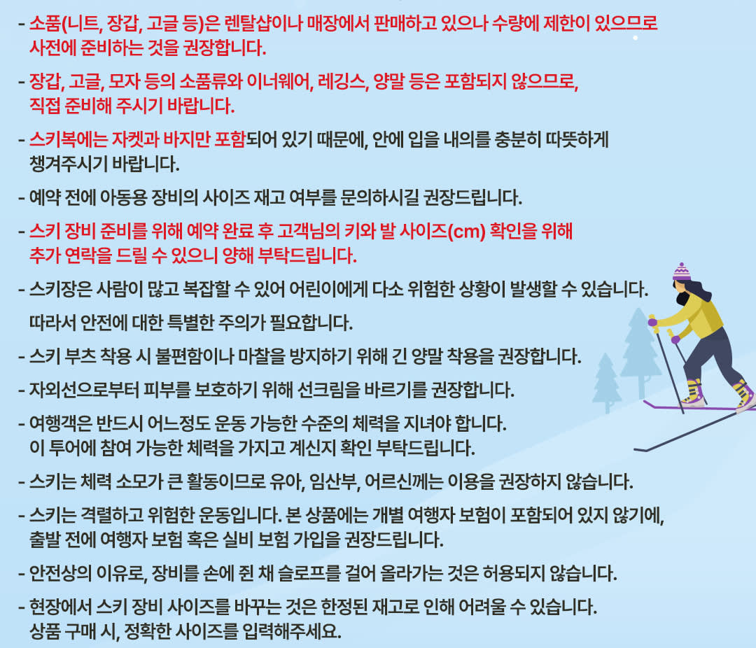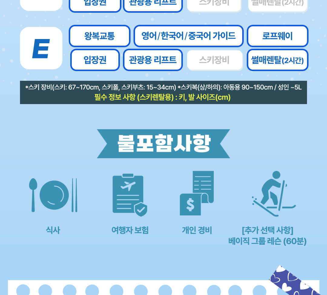 ▶B: 장비 플랜 (로프웨이 + 리프트 + 스키 장비) - 이용요건 * 만 3-12세는 반드시 티켓을 소지한 성인을 동반해야 합니다. * 그룹 규모: 참여자 수 1-49인 - 추가정보 * 안전 정책: 스키 장비를 착용하지 않은 경우 스키 슬로프 이용이 금지됩니다. * 일본 법규에 따라 차량은 10시간 이상 운행할 수 없습니다. 투어 가이드가 실시간 상황에 따라 일정을 조정할 수 있습니다. * 교통 및 기상 상황에 따라 일정이 변경될 수 있습니다. * 여행 중 개인 소지품 분실에 대해서는 책임지지 않으니, 소지품 관리에 유의해 주시기 바랍니다. * 장갑, 모자, 고글 등 액세서리는 렌탈샵이나 매장에서 구매할 수 있지만, 수량이 한정적이므로 미리 준비하는 것을 추천합니다. * 장갑, 고글, 모자, 내의, 레깅스, 양말 등의 액세서리는 포함되어 있지 않으니 직접 준비해 주세요. * 예약 전 아동 장비 사이즈 이용 가능 여부를 문의하시는 것이 좋습니다. * 스키장은 붐비는 시간대에 어린이에게 위험할 수 있으니 안전에 각별히 유의하시기 바랍니다. * 스키 부츠 착용 시 불편함이나 쓸림을 방지하기 위해 긴 양말을 착용하는 것이 좋습니다. * 자외선으로부터 피부를 보호하기 위해 자외선 차단제를 가져와서 바르는 것이 좋습니다. * 여행객은 어느 정도의 체력이 필요합니다. 투어 참여에 적합한 건강 상태인지 확인해주세요. * 스키는 체력을 많이 소모하는 활동이므로, 유아, 임산부, 노약자에게는 권장하지 않습니다. * 스키는 격렬하고 잠재적으로 위험한 스포츠입니다. 여행자 보험은 투어에 포함되어 있지 않으므로, 출발 전 여행자 보험이나 상해 보험에 가입하시는 것을 권장합니다. * 안전상의 이유로 스키장 내에서는 장비를 들고 슬로프를 걸어 올라가는 것이 금지되어 있습니다. * 재고가 한정적인 관계로 현장에서 장비 사이즈 변경이 불가할 수 있습니다. 예약 시 정확한 사이즈를 입력해 주시기 바랍니다. * 투어 당일 짐이나 스키 장비를 가지고 오시는 경우, 사전에 알려주시기 바랍니다. 공간이 부족할 경우 반입이 거부될 수 있습니다. - 규정 및 제한사항 * 거동이 불편하신 분에게는 본 액티비티를 권장하지 않습니다. * 임신부에게는 본 액티비티를 권장하지 않습니다. * 본 액티비티는 고혈압, 간질 등의 의학적 질환을 앓고 계신 분에게는 권장하지 않습니다. - 준비물 * 스키복은 재킷과 바지만 포함되어 있으므로, 안에 충분히 따뜻하게 입을 수 있는 기본 레이어를 반드시 챙겨오세요. - 편의성/접근성 * 휠체어 이용이 불가합니다. * 유모차 이용이 가능합니다. - Address * 1547-1 Kido, Otsu, 시가 - 차량 & 수하물 정보 * 탑승 가능 인원수: 49인 (운전기사 제외)