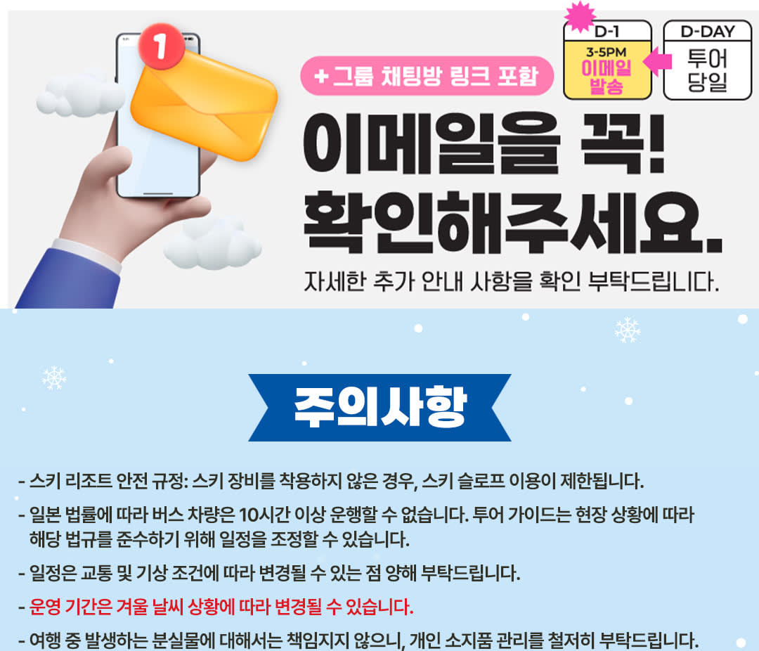 ▶E: 눈썰매 & 눈놀이 (로프웨이 + 관광 리프트 + 썰매) - 이용요건 * 만 3-12세는 반드시 티켓을 소지한 성인을 동반해야 합니다. * 만 0-2세는 별도의 좌석이 필요하지 않은 경우 무료입니다. * 본 상품은 이용 가능 연령이 제한되어 있지 않습니다. * 그룹 규모: 참여자 수 1-49인 - 추가정보 * 안전 정책: 스키 장비를 착용하지 않은 경우 스키 슬로프 이용이 금지됩니다. * 일본 법규에 따라 차량은 10시간 이상 운행할 수 없습니다. 투어 가이드가 실시간 상황에 따라 일정을 조정할 수 있습니다. * 교통 및 기상 상황에 따라 일정이 변경될 수 있습니다. * 여행 중 개인 소지품 분실에 대해서는 책임지지 않으니, 소지품 관리에 유의해 주시기 바랍니다. * 장갑, 모자, 고글 등 액세서리는 렌탈샵이나 매장에서 구매할 수 있지만, 수량이 한정적이므로 미리 준비하는 것을 추천합니다. * 장갑, 고글, 모자, 내의, 레깅스, 양말 등의 액세서리는 포함되어 있지 않으니 직접 준비해 주세요. * 스키장은 붐비는 시간대에 어린이에게 위험할 수 있으니 안전에 각별히 유의하시기 바랍니다. * 스키 부츠 착용 시 불편함이나 쓸림을 방지하기 위해 긴 양말을 착용하는 것이 좋습니다. * 자외선으로부터 피부를 보호하기 위해 자외선 차단제를 가져와서 바르는 것이 좋습니다. * 안전상의 이유로 스키장 내에서는 장비를 들고 슬로프를 걸어 올라가는 것이 금지되어 있습니다. * 투어 당일 짐이나 스키 장비를 가지고 오시는 경우, 사전에 알려주시기 바랍니다. 공간이 부족할 경우 반입이 거부될 수 있습니다. - 편의성/접근성 * 휠체어 이용이 불가합니다. * 유모차 이용이 가능합니다. - Address * 1547-1 Kido, Otsu, 시가 - 차량 & 수하물 정보 * 탑승 가능 인원수: 49인 (운전기사 제외)