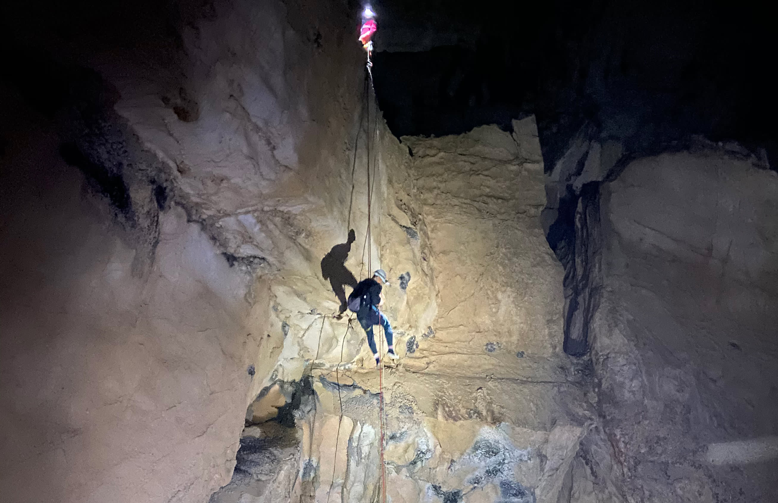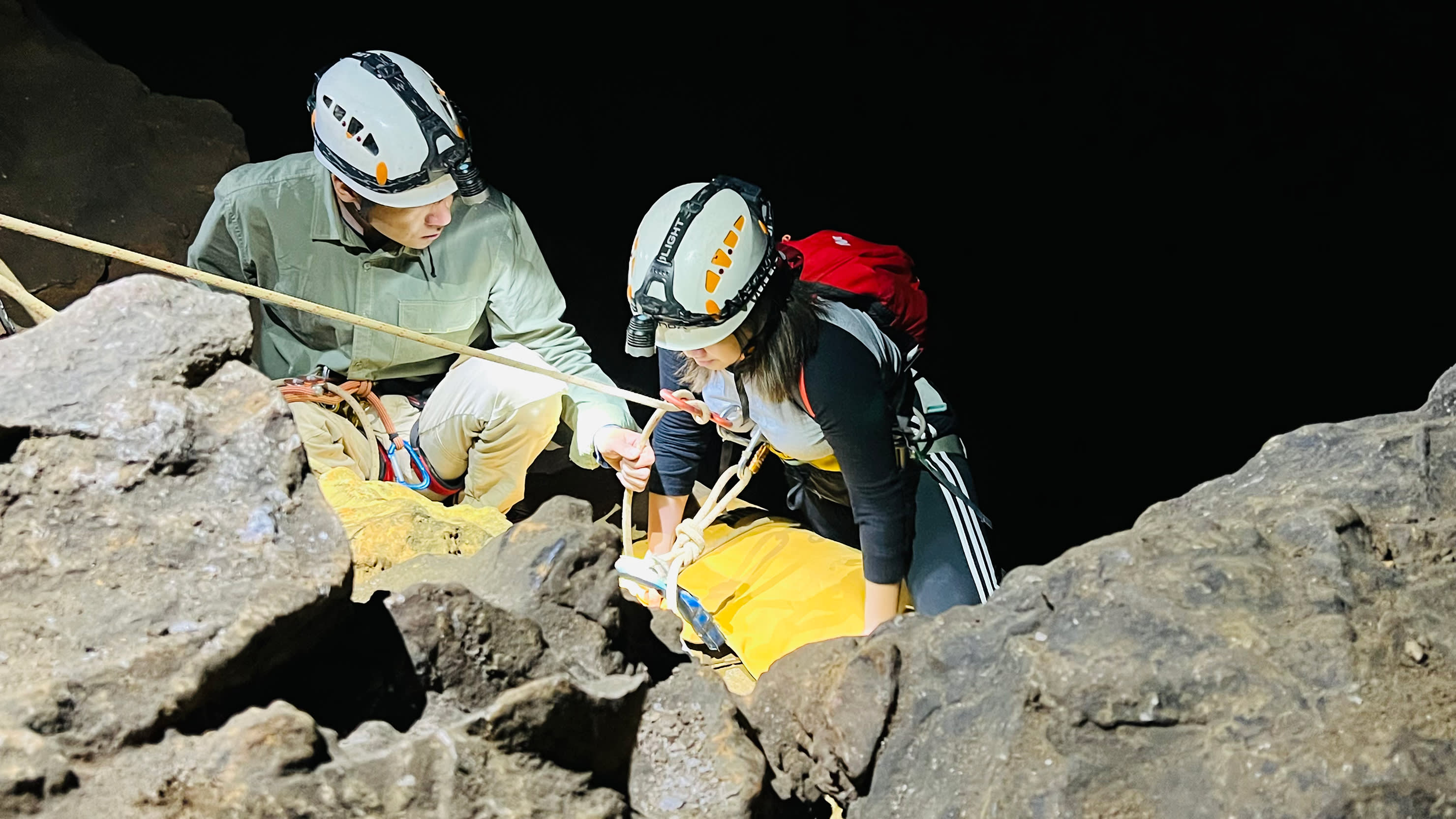 * 로프 기술 장비, 안전 벨트, 헬멧, 헤드램프를 갖춘 전문 코치, 동굴 내 흥미로운 설명.