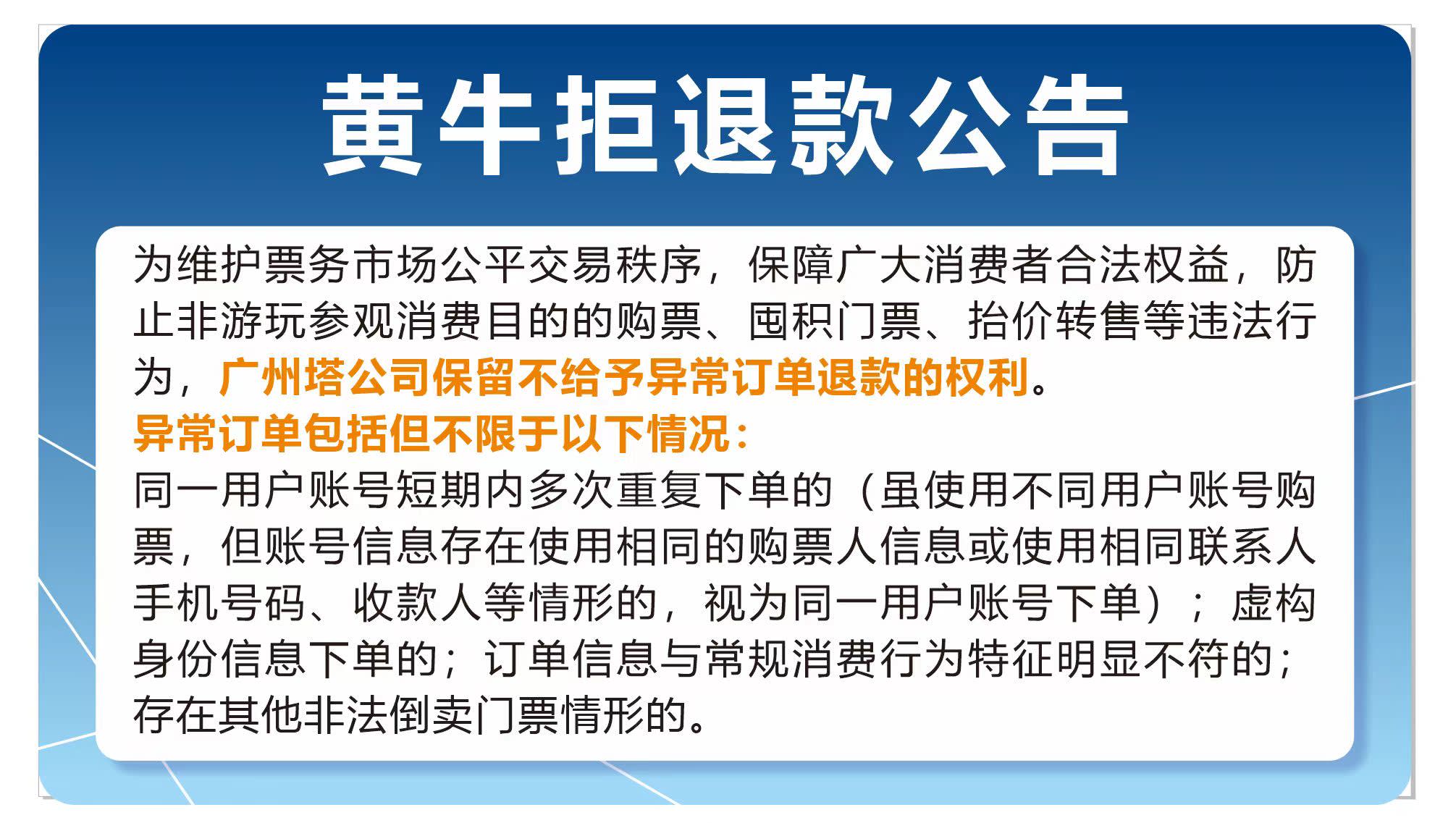 - 【주의사항】: * 어린이는 신분증이 없는 경우 동반하는 성인의 신분증으로 티켓을 구매할 수 있습니다. * 【영업시간】 광저우 타워 영업시간은 09:30-22:30이며, 관광객 입장 시간은 09:30-22:00입니다. 공휴일 및 특별 행사일은 현장 매표소 공지를 기준으로 합니다. 【티켓 수령 방법】 티켓 교환 및 탑승 시 본인 유효 신분증을 제시해야 하며, 방문 당일 티켓 교환 바우처 또는 유효 신분증을 지참하여 광저우 타워 서쪽 매표소에서 티켓으로 교환해야 합니다. 동일한 주문은 한 번에 티켓을 수령해야 합니다. 【시간대별 관광】 관광객은 구매한 티켓 시간대에 따라 티켓을 교환하고 타워에 입장해야 합니다. 개인적인 사유로 인해 입장 마감 시간을 놓쳐 타워에 입장할 수 없는 경우 발생하는 손실은 관광객 본인이 부담해야 합니다. 【특별 운휴】 실외 관광 구역은 날씨의 영향을 받기 쉬우므로 관광객은 날씨 상황과 광저우 타워 웨이보 및 위챗 공식 계정의 관련 공지를 수시로 확인하시기 바랍니다. 방문 당일 날씨 불가항력적인 요인이나 놀이기구 기계 설비 유지 보수 등의 사유로 인해 광저우 타워 일부 프로젝트가 지연되거나 일시 중단될 경우: (1) 티켓을 교환하지 않은 관광객은 방문 당일 씨트립 고객센터에 연락하여 전액 환불을 신청할 수 있습니다. (2) 티켓을 교환한 관광객은 관광지 현장 직원의 안내에 따라 이용하지 못한 부분에 대해 환불 또는 연기를 진행하십시오(타워 입장 후 가시거리가 낮거나 비, 안개 등의 날씨는 환불 사유가 될 수 없습니다). 【안전 검사】 타워 입장 전 광저우 타워 보안 검색 직원의 안전 검사에 협조해 주시고, 라이터 등 인화성 폭발물, 음료, 무선 조종 장난감, 항공 모형 및 연 등 하늘로 날릴 수 있는 물품(자세한 내용은 광저우 타워 보안 검색 규정 참조)을 소지하고 탑승하지 마십시오. 【안전 수칙】 신장 1.4m 미만, 1.95m 초과, 체중 95kg 초과, 만 65세 이상, 임산부 또는 고소공포증, 고혈압, 심장병, 정신 질환, 음주, 의족 착용 또는 거동이 불편한 관광객은 익스트림 클라우드에 참여하는 데 적합하지 않습니다. 신장 1.5m 미만 어린이가 놀이 활동에 참여하는 경우 반드시 성인이 동반해야 합니다. 놀이 시설 안전 규정을 준수하지 않는 관광객에 대해 직원은 놀이 자격을 거부할 권리가 있으며, 이로 인해 발생하는 불리한 결과에 대해서는 관광객 본인이 해당 경제적 및 법적 책임을 져야 합니다. - 입장 시간: * 광저우 타워는 시간대별로 관광을 진행해야 하며, 다음 6개 시간대로 나뉩니다. * 9:30 - 12:00 * 12:00 - 14:00 * 14:00 - 16:00 * 16:00 - 18:00 * 18:00 - 20:00 * 20:00 - 22:00 * 관광객은 구매한 티켓 시간대에 따라 티켓을 교환하고 타워에 입장해야 하며, 개인적인 사유로 인해 입장 마감 시간을 놓쳐 타워에 입장할 수 없는 경우 발생하는 손실은 관광객 본인이 부담해야 합니다.