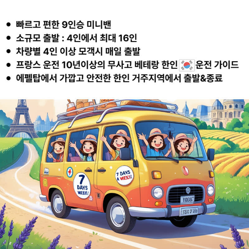 - 각 차량별 프랑스내 10년이상의 무사고 운전 베테랑 한국인 가이드가 고객님을 안전하게 모십니다.