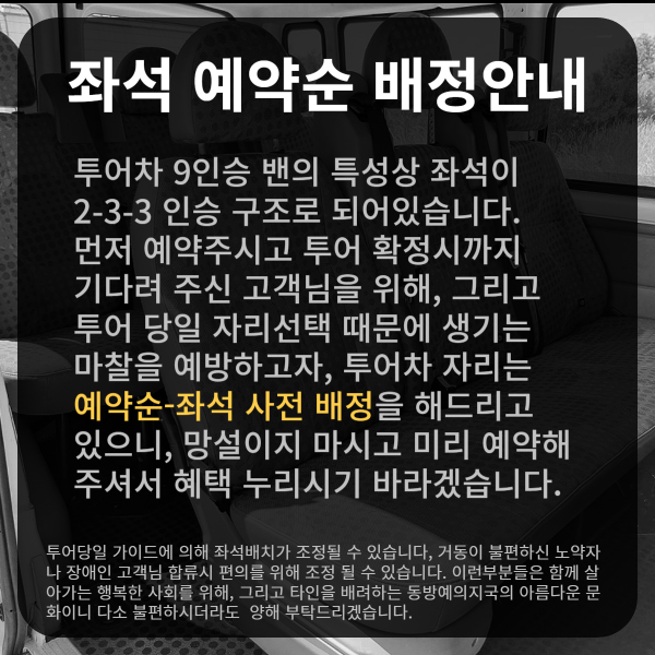 * 예약순서에 따라 투어차 좌석 배정이 되는 시스템으로 예약이 빠르실 수록 선호자리에 배정 되십니다.