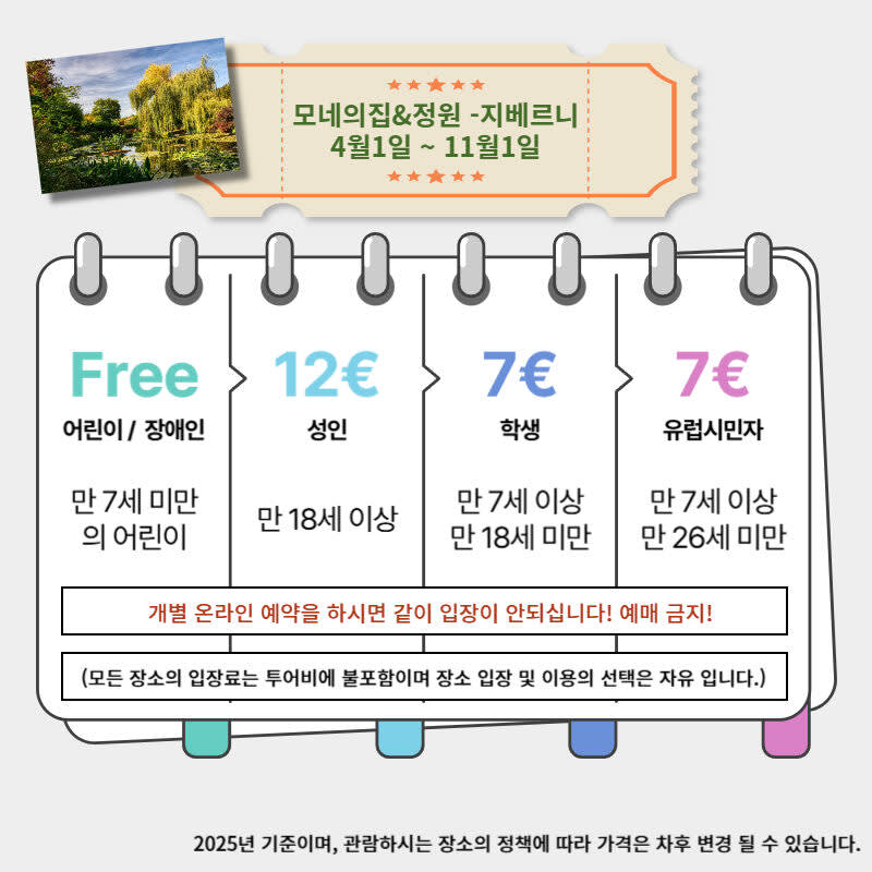 👨🎨 모네의 집,정원: 성인 12.5€(대행13€), 학생 7€(대행7.5€), 어린이 무료