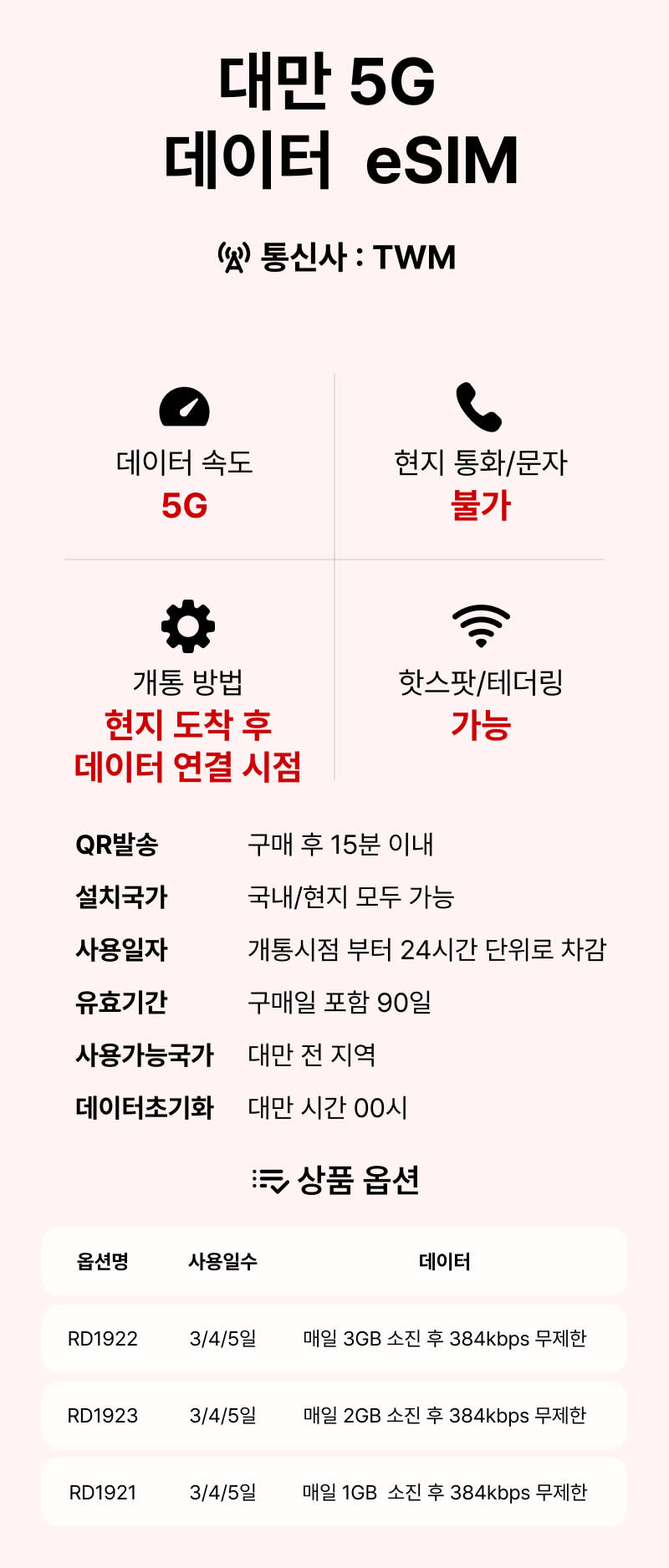 [말톡 대만 이심] eSIM 가오슝 타이베이 5G 매일 3GB/2GB/1GB 핫스팟 로밍전화