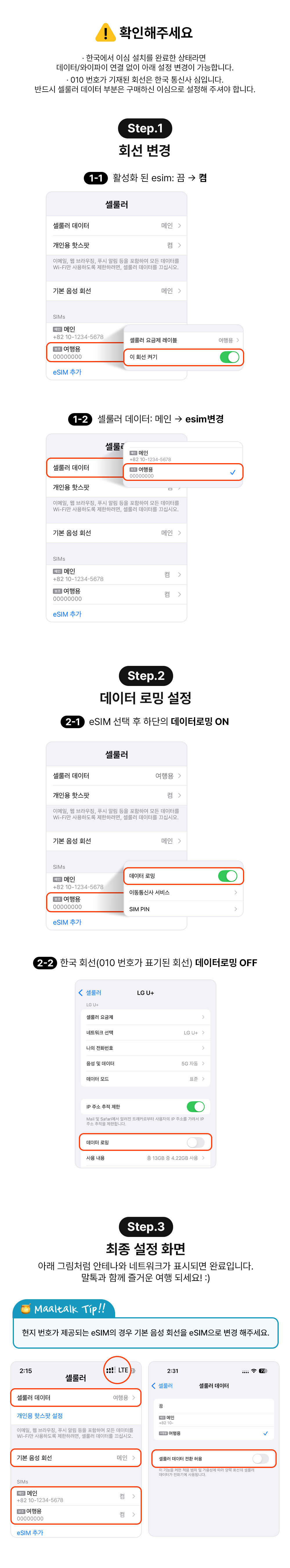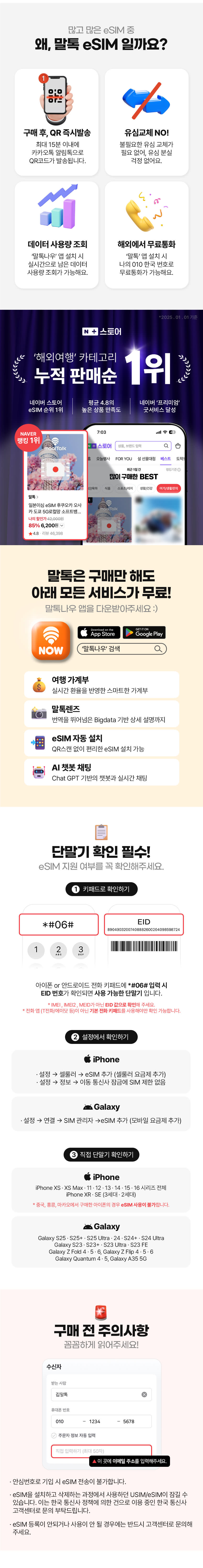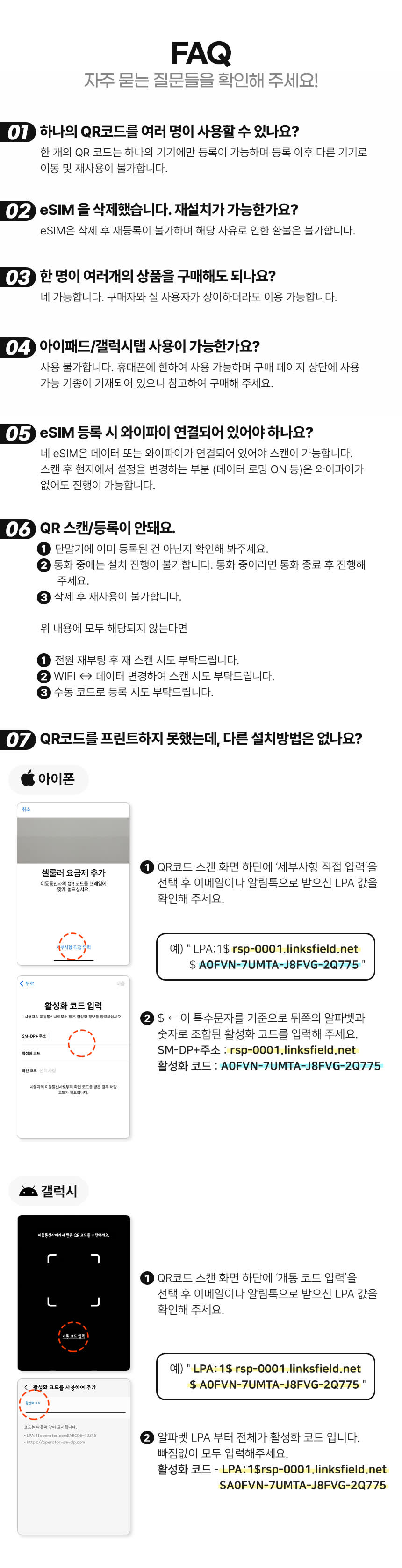상세내용에 표기 되어 있습니다. eSIM 구매후 발송되는 알림톡에 QR코드와 같이 사용방법이 안내 되어 있습니다.