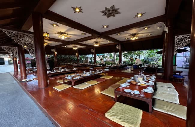 낮은 테이블을 두고 바닥에 앉아 식사를 하는 태국 전통 방식에 따라 식사가 진행되며