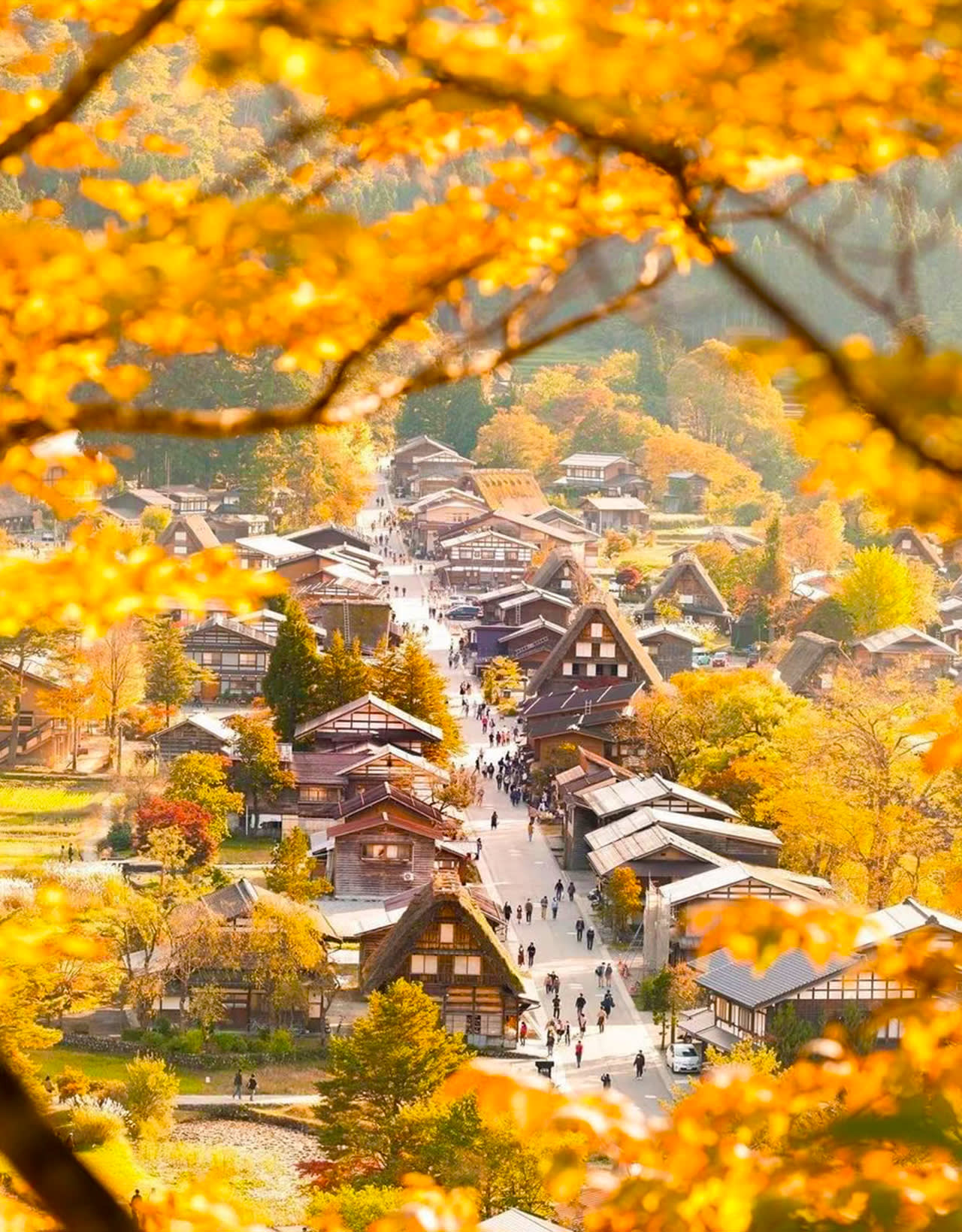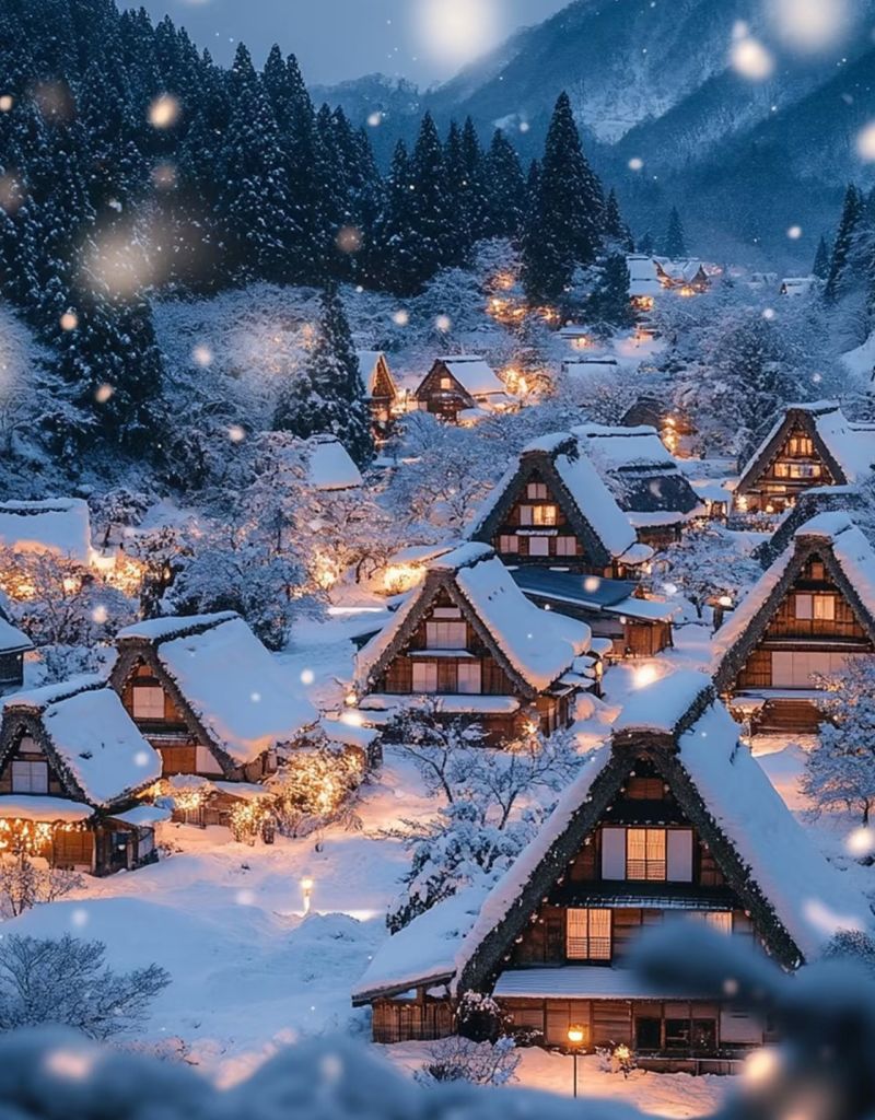 【시라카와고 갓쇼무라】 시라카와고는 일본 기후현에 있으며 독특한 갓쇼즈쿠리 목조 가옥으로 유명하며 세계문화유산으로 지정되었습니다. 가을에는 마치 대자연이 팔레트를 엎어놓은 듯 단풍, 노란 잎과 고풍스러운 목조 가옥이 어우러져 겨울에 눈이 내린 후 이곳은 미야자키 하야오의 동화 세계입니다.