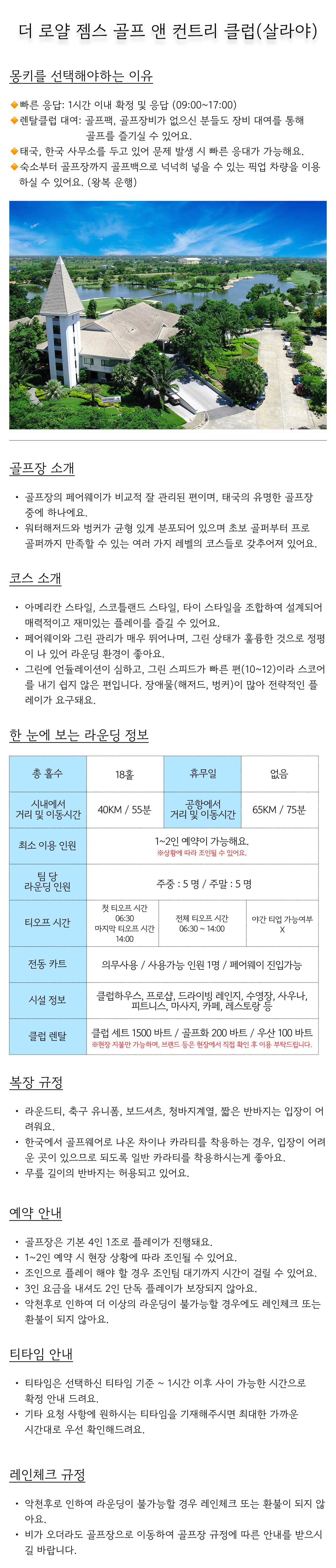 🍱 레스토랑 정보 - 레스토랑 운영 시간 월 : 08:00 화 ~ 금 : 06:00 토 ~ 일 : 05:30 마지막 주문 시간 : 19:00 - 식사는 태국식, 일식이 있어요. 🚗 차량 정보 - 승용차 : 1~3인, 골프백 3개 또는 골프백 2개 + 20인치 캐리어 2개 - 밴 : 1~9인, 골프백 8개 또는 골프백 6개 + 20인치 캐리어 6개 💲 캐디팁 - 태국의 골프장은 캐디피와 별도로 캐디팁을 반드시 지불해야해요. - 캐디팁은 골프장에 따라 조금씩 다르나, 18홀 당 500바트 이상의 캐디팁을 권장해요. - 캐디팁은 라운딩 종료 후 캐디에게 직접 지불해주시면 돼요. ❗ 기타 - 부득이하게 추가 금액이 발생 되는 경우, 예약 진행 시 사전 안내 드립니다. - 개별 여행자 보험 가입을 권장 드려요. - 토, 일요일 및 태국 공휴일에는 주말 요금이 적용돼요. - 현금 및 귀중품 분실과 개인 안전 사고에 유의해주세요. - 외부에서 구입한 음료 및 음식물은 필드로 반입이 불가능해요. 라운딩 전 적발 시 : 음식 및 음료 제외한 후 라운딩 시작 혹은 심한 경우에는 티오프 불가 (환불 불가) 라운딩 중 적발 시 : 라운딩 진행 불가 및 퇴장 조치 (환불 불가)
