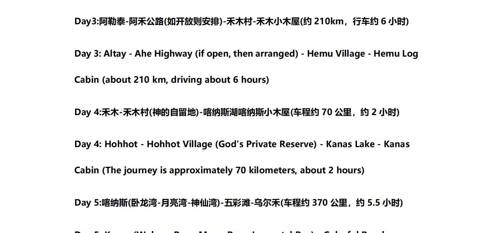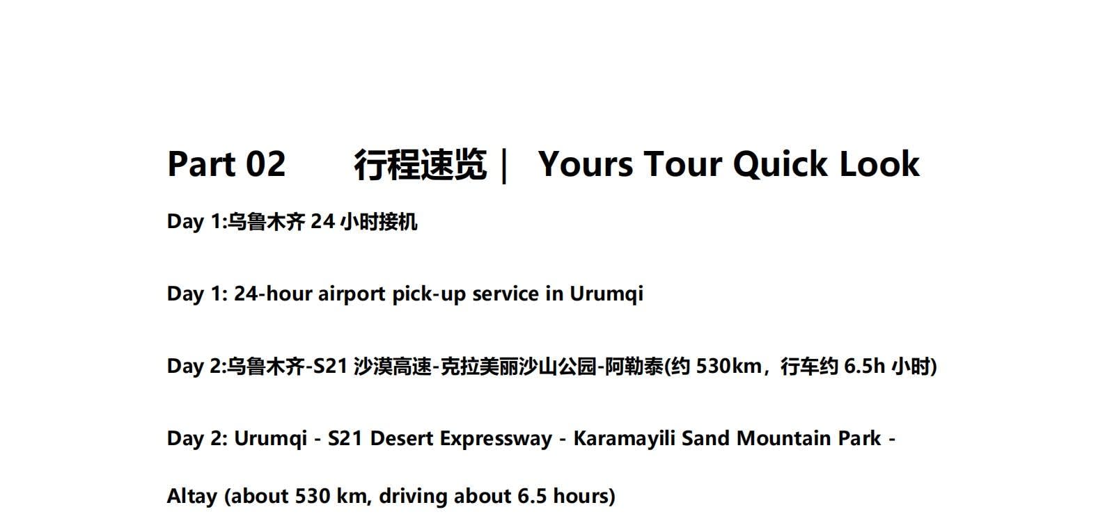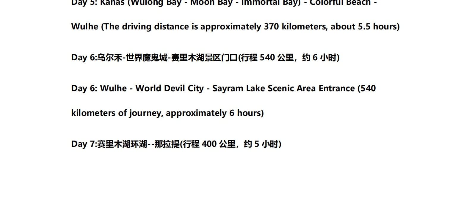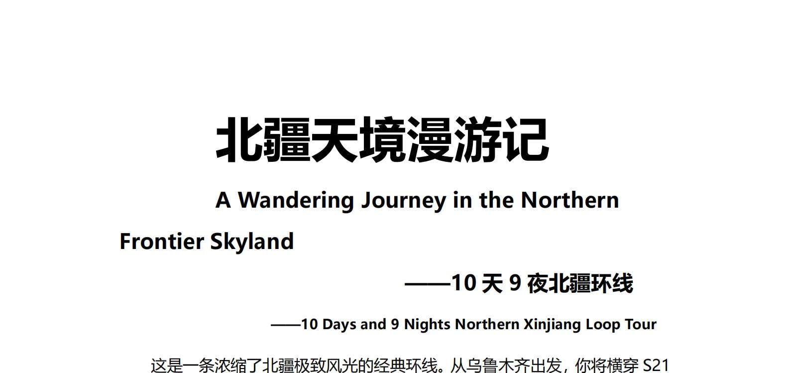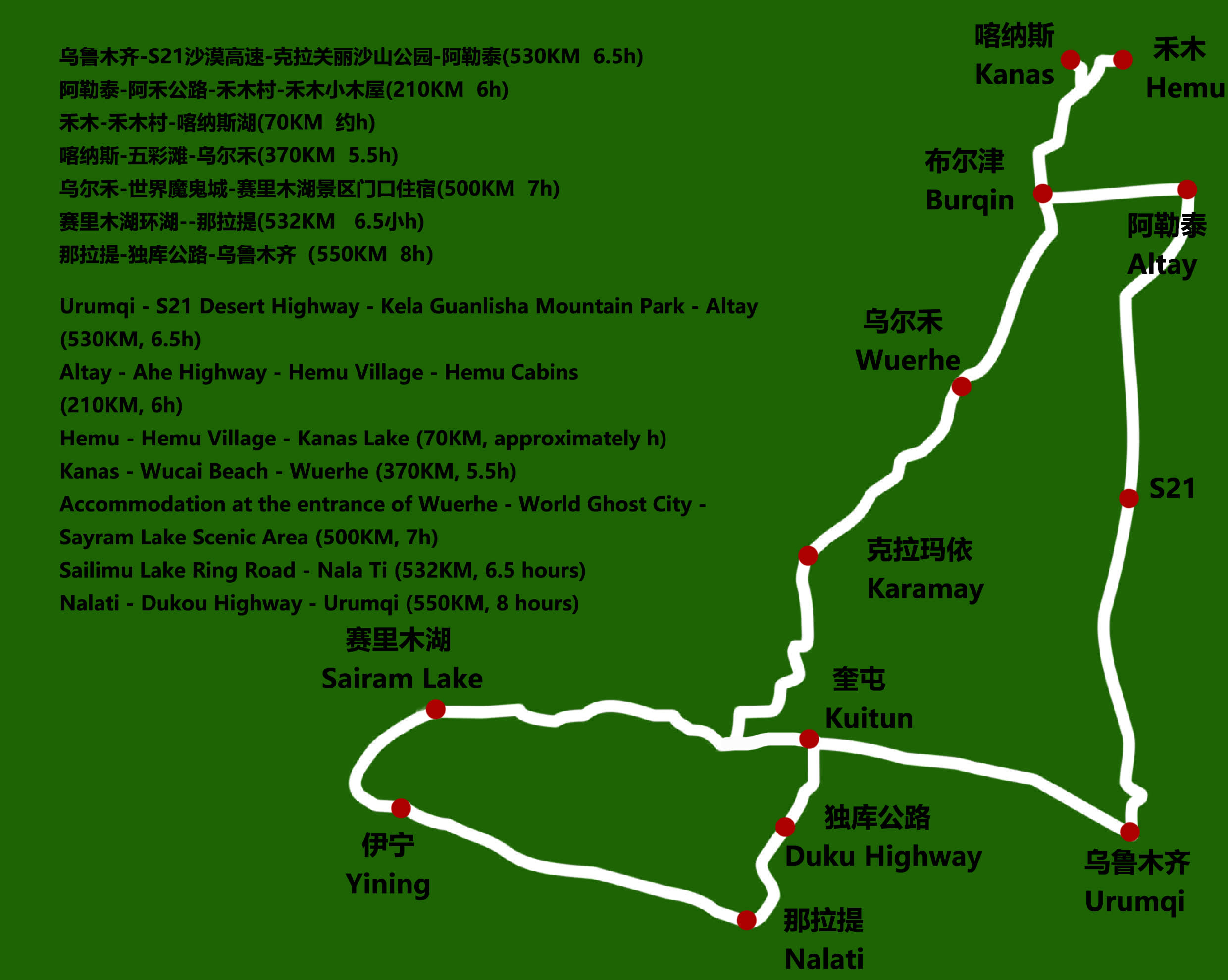 • 1일차: 우루무치 24시간 공항 픽업 서비스 2일차: 우루무치 - S21 사막 고속도로 - 카라마일리 사구 공원 - 알타이 3일차: 알타이 - 아허 고속도로 (개통 시 이용) - 허무촌 - 허무 통나무집 4일차: 호호트 - 호호트 마을 (신의 프라이빗 보호구역) - 카나스 호수 - 카나스 캐빈 5일차: 카나스 (우롱만 - 문베이 - 이모탈 베이) - 컬러풀 비치 - 우얼허 6일차: 우얼허 - 세계 악마의 도시 - 사이람 호수 풍경구 입구 7일차: 사이람 호수 일주 - 나랏 8일차: 나랏 - 나랏 하늘 초원 - 징허 9일차: 징허 - 무타하르 사막 - 우루무치 10일차: 우루무치 24시간 공항 픽업 서비스