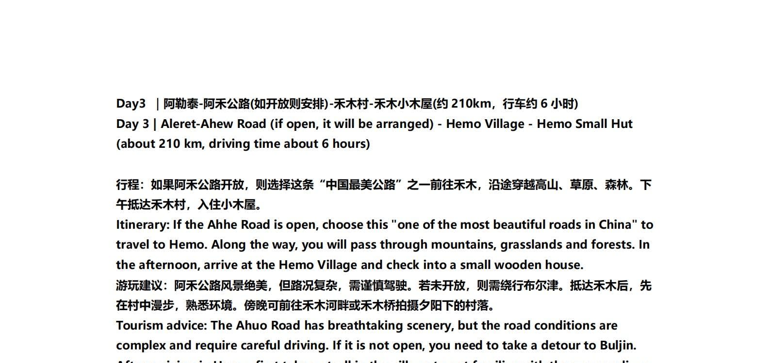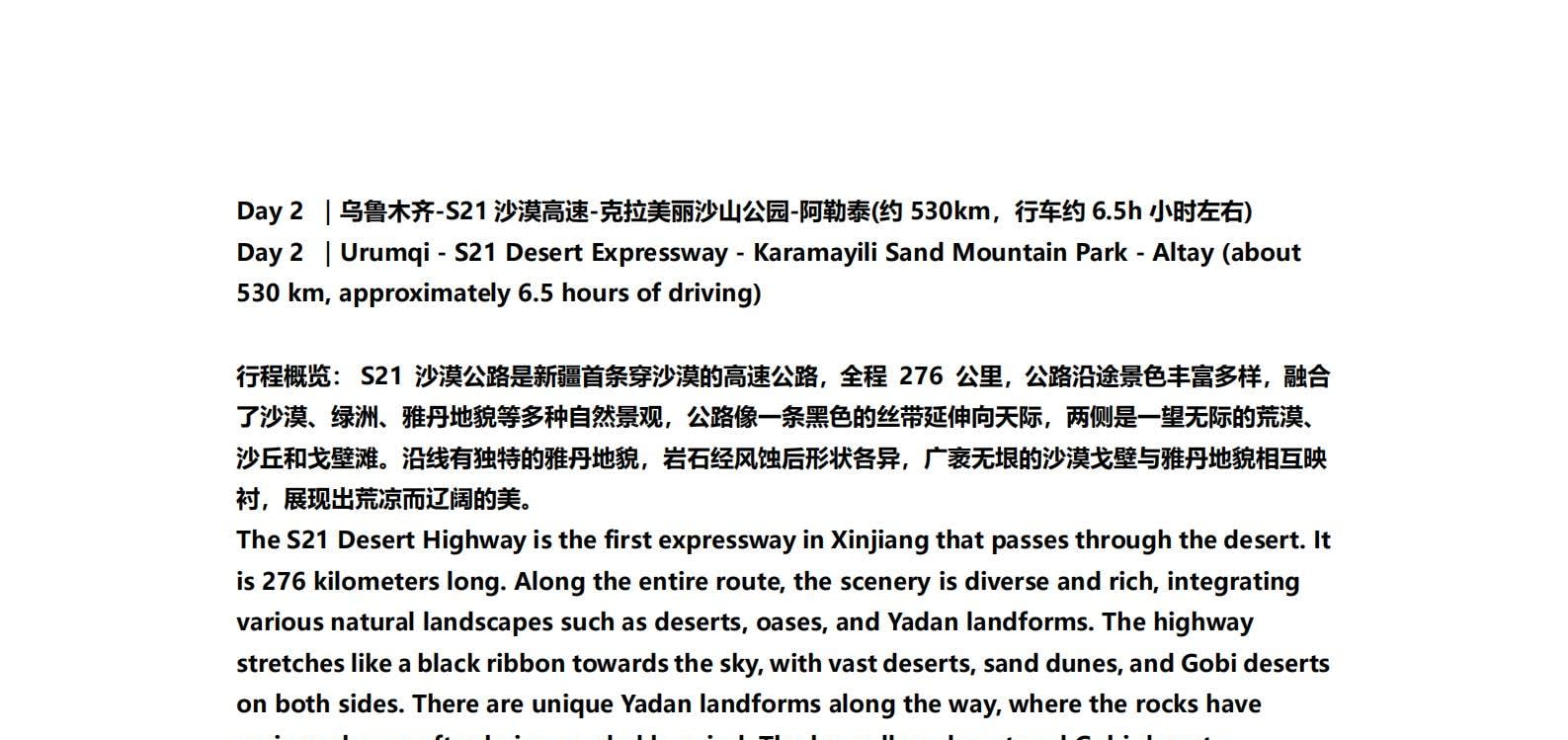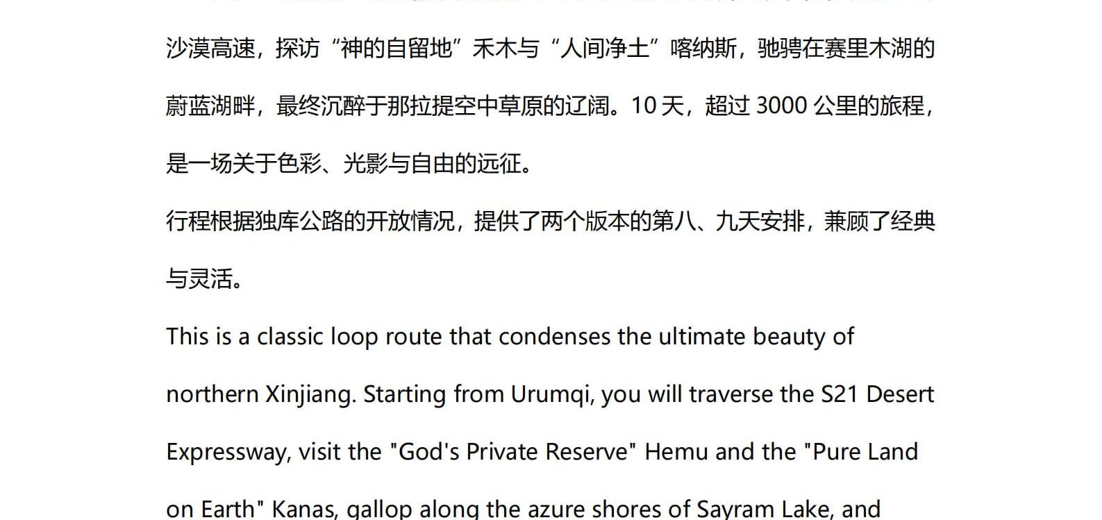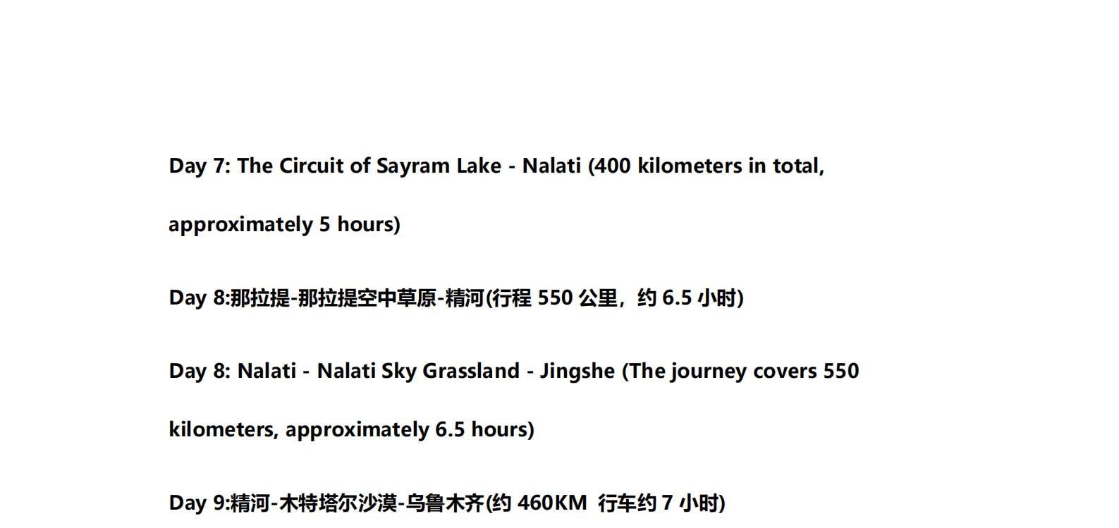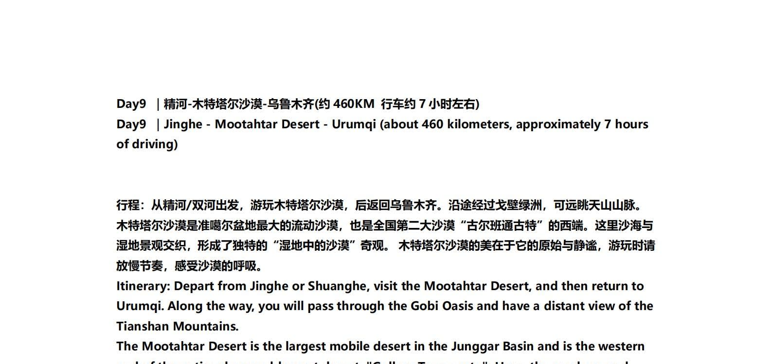 • 1일차: 우루무치 24시간 공항 픽업 서비스 2일차: 우루무치 - S21 사막 고속도로 - 카라마일리 사구 공원 - 알타이 3일차: 알타이 - 아허 고속도로 (개통 시 이용) - 허무촌 - 허무 통나무집 4일차: 호호트 - 호호트 마을 (신의 프라이빗 보호구역) - 카나스 호수 - 카나스 캐빈 5일차: 카나스 (우롱만 - 문베이 - 이모탈 베이) - 컬러풀 비치 - 우얼허 6일차: 우얼허 - 세계 악마의 도시 - 사이람 호수 풍경구 입구 7일차: 사이람 호수 일주 - 나랏 8일차: 나랏 - 나랏 하늘 초원 - 징허 9일차: 징허 - 무타하르 사막 - 우루무치 10일차: 우루무치 24시간 공항 픽업 서비스