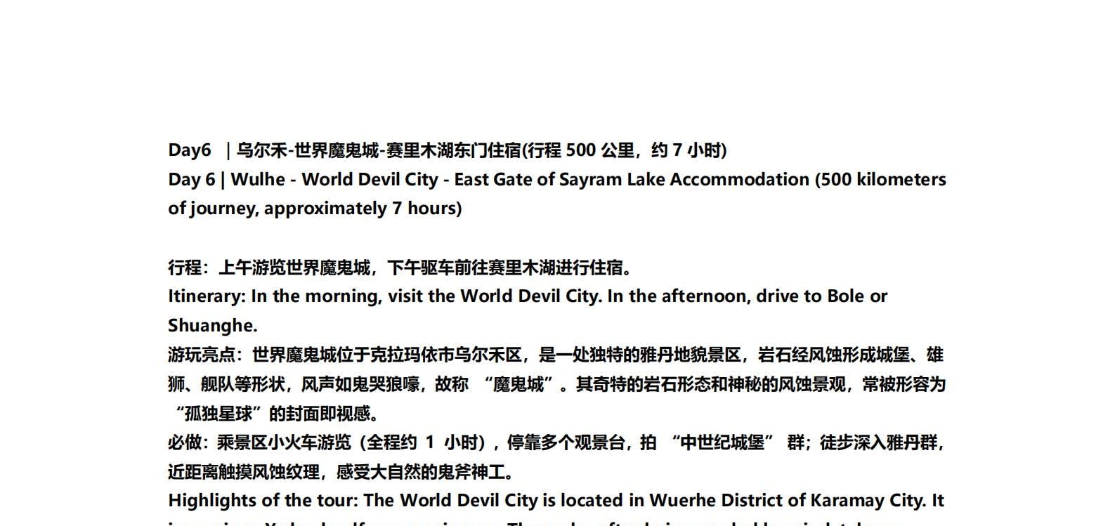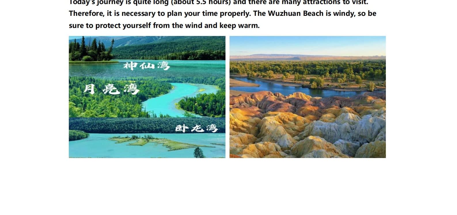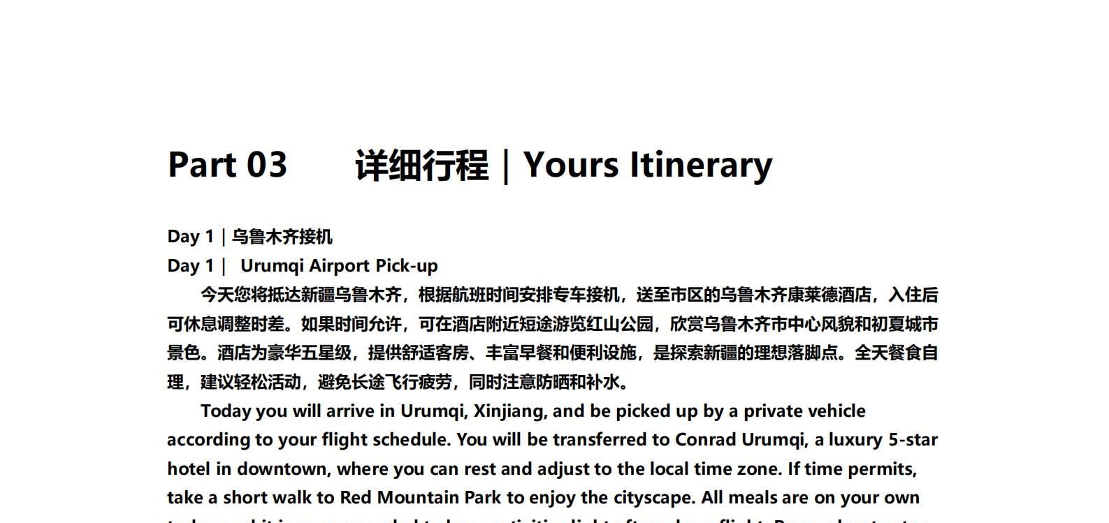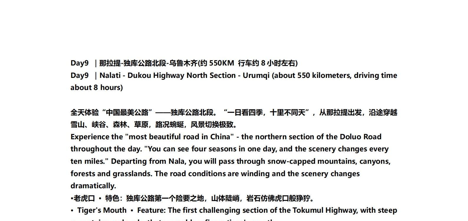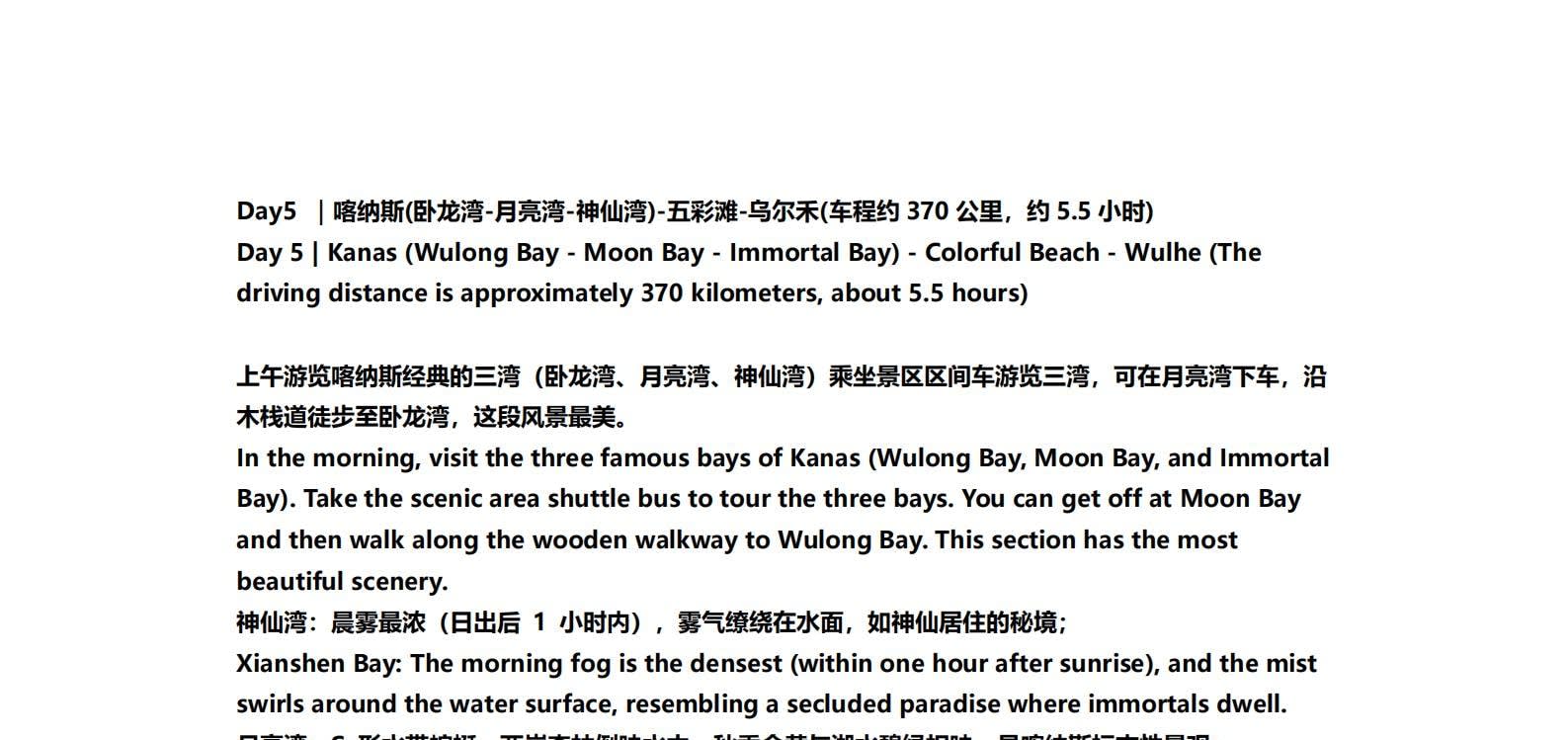 • 1일차: 우루무치 24시간 공항 픽업 서비스 2일차: 우루무치 - S21 사막 고속도로 - 카라마일리 사구 공원 - 알타이 3일차: 알타이 - 아허 고속도로 (개통 시 이용) - 허무촌 - 허무 통나무집 4일차: 호호트 - 호호트 마을 (신의 프라이빗 보호구역) - 카나스 호수 - 카나스 캐빈 5일차: 카나스 (우롱만 - 문베이 - 이모탈 베이) - 컬러풀 비치 - 우얼허 6일차: 우얼허 - 세계 악마의 도시 - 사이람 호수 풍경구 입구 7일차: 사이람 호수 일주 - 나랏 8일차: 나랏 - 나랏 하늘 초원 - 징허 9일차: 징허 - 무타하르 사막 - 우루무치 10일차: 우루무치 24시간 공항 픽업 서비스