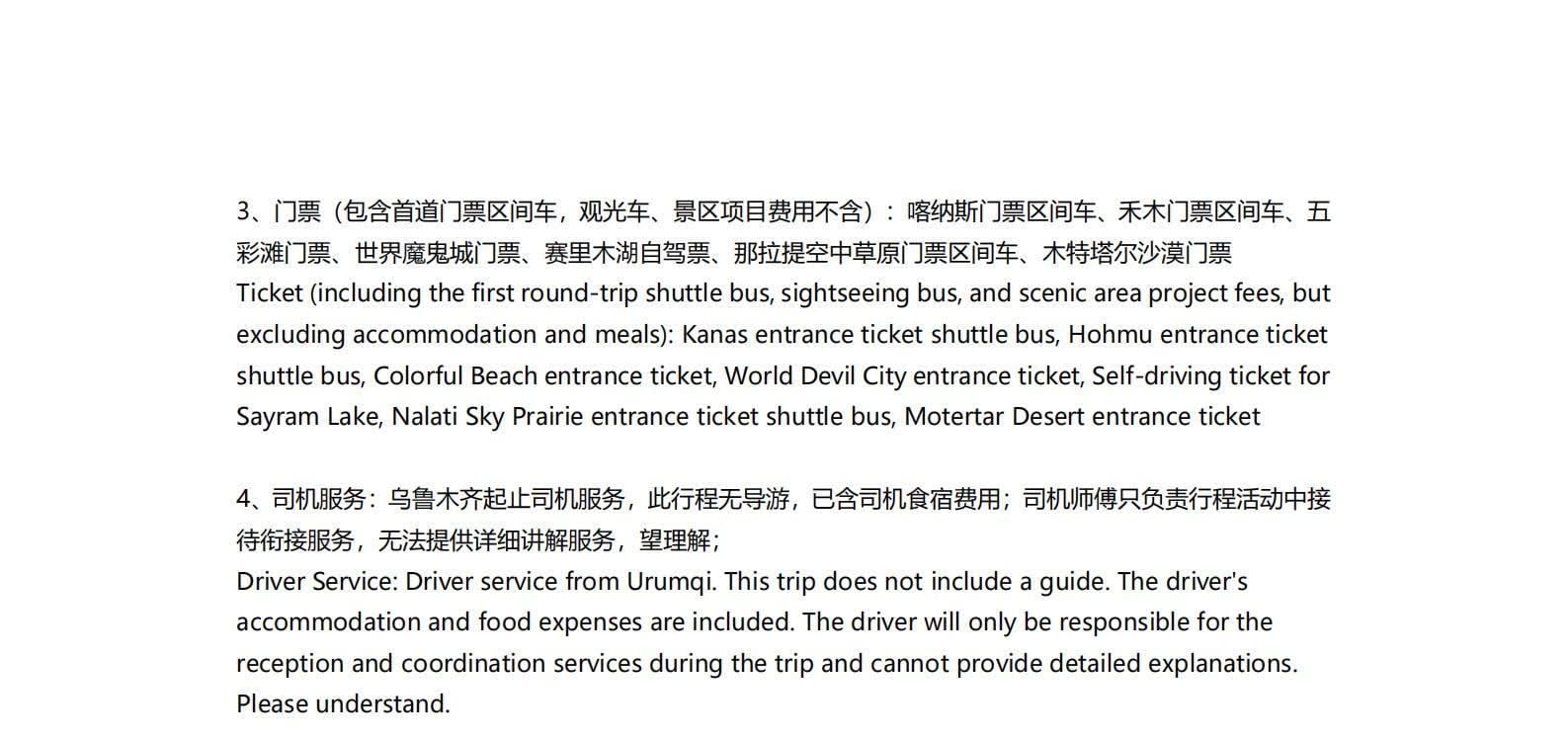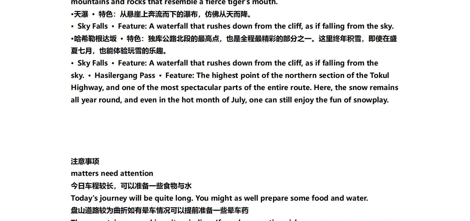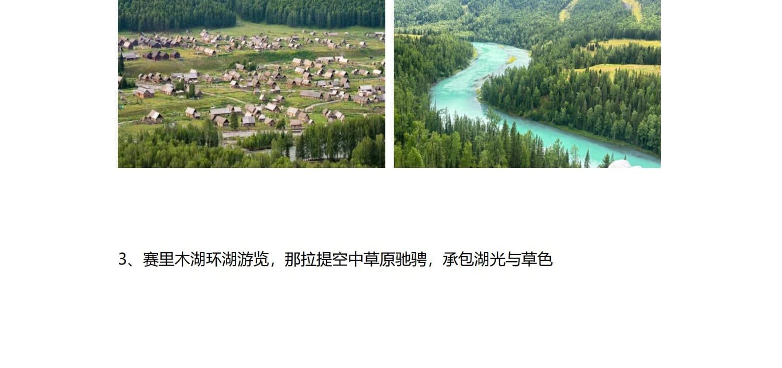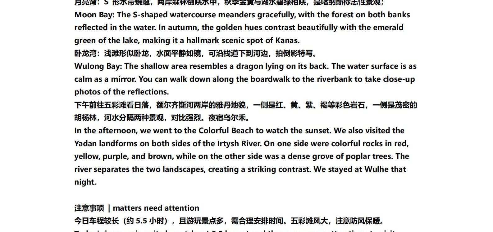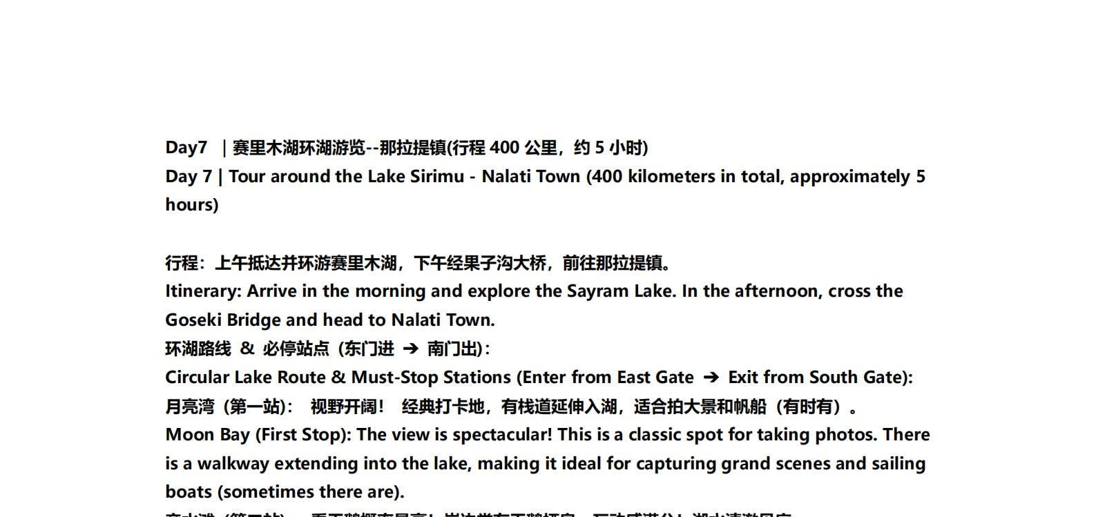 • 1일차: 우루무치 24시간 공항 픽업 서비스 2일차: 우루무치 - S21 사막 고속도로 - 카라마일리 사구 공원 - 알타이 3일차: 알타이 - 아허 고속도로 (개통 시 이용) - 허무촌 - 허무 통나무집 4일차: 호호트 - 호호트 마을 (신의 프라이빗 보호구역) - 카나스 호수 - 카나스 캐빈 5일차: 카나스 (우롱만 - 문베이 - 이모탈 베이) - 컬러풀 비치 - 우얼허 6일차: 우얼허 - 세계 악마의 도시 - 사이람 호수 풍경구 입구 7일차: 사이람 호수 일주 - 나랏 8일차: 나랏 - 나랏 하늘 초원 - 징허 9일차: 징허 - 무타하르 사막 - 우루무치 10일차: 우루무치 24시간 공항 픽업 서비스