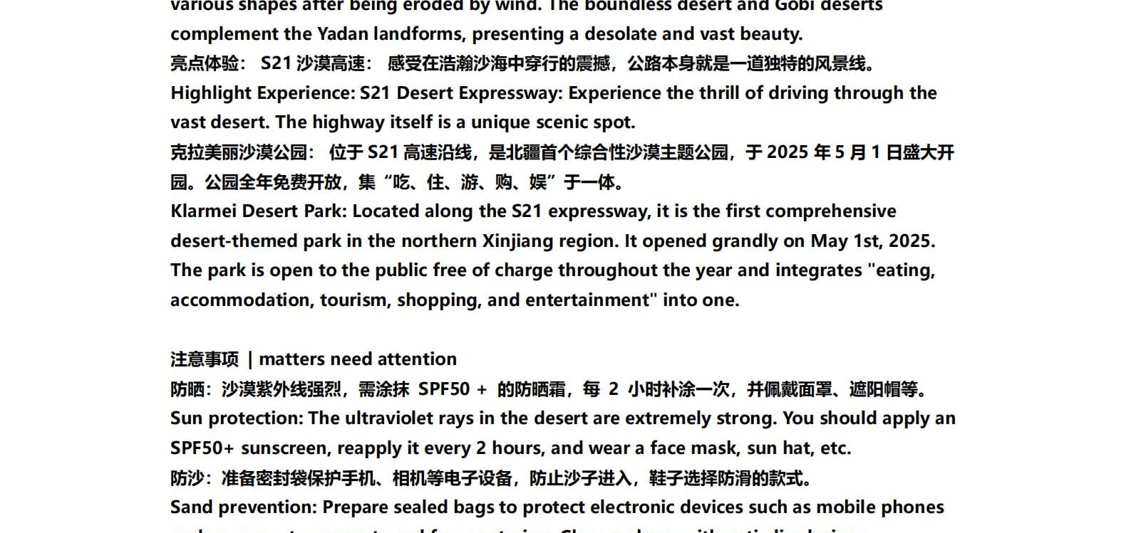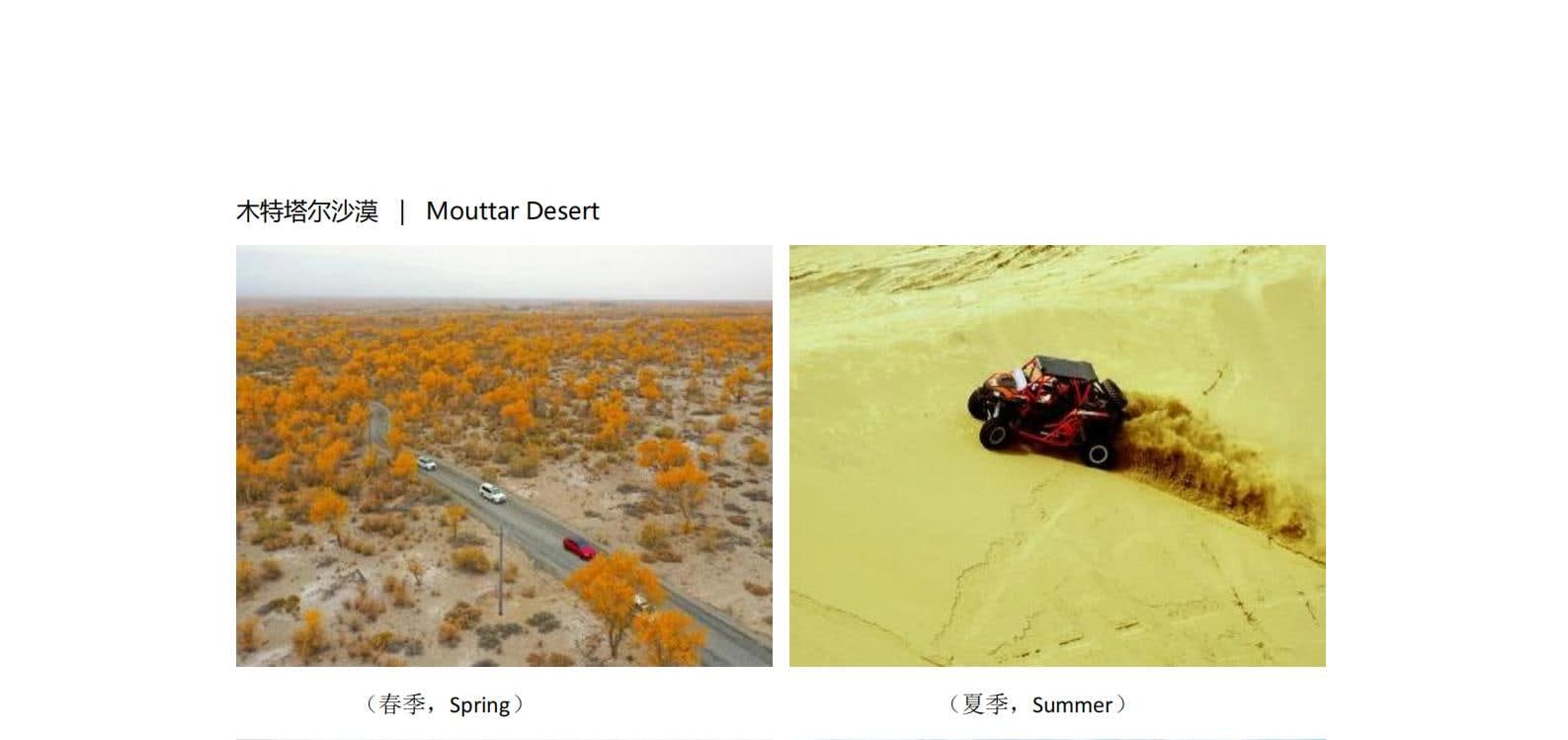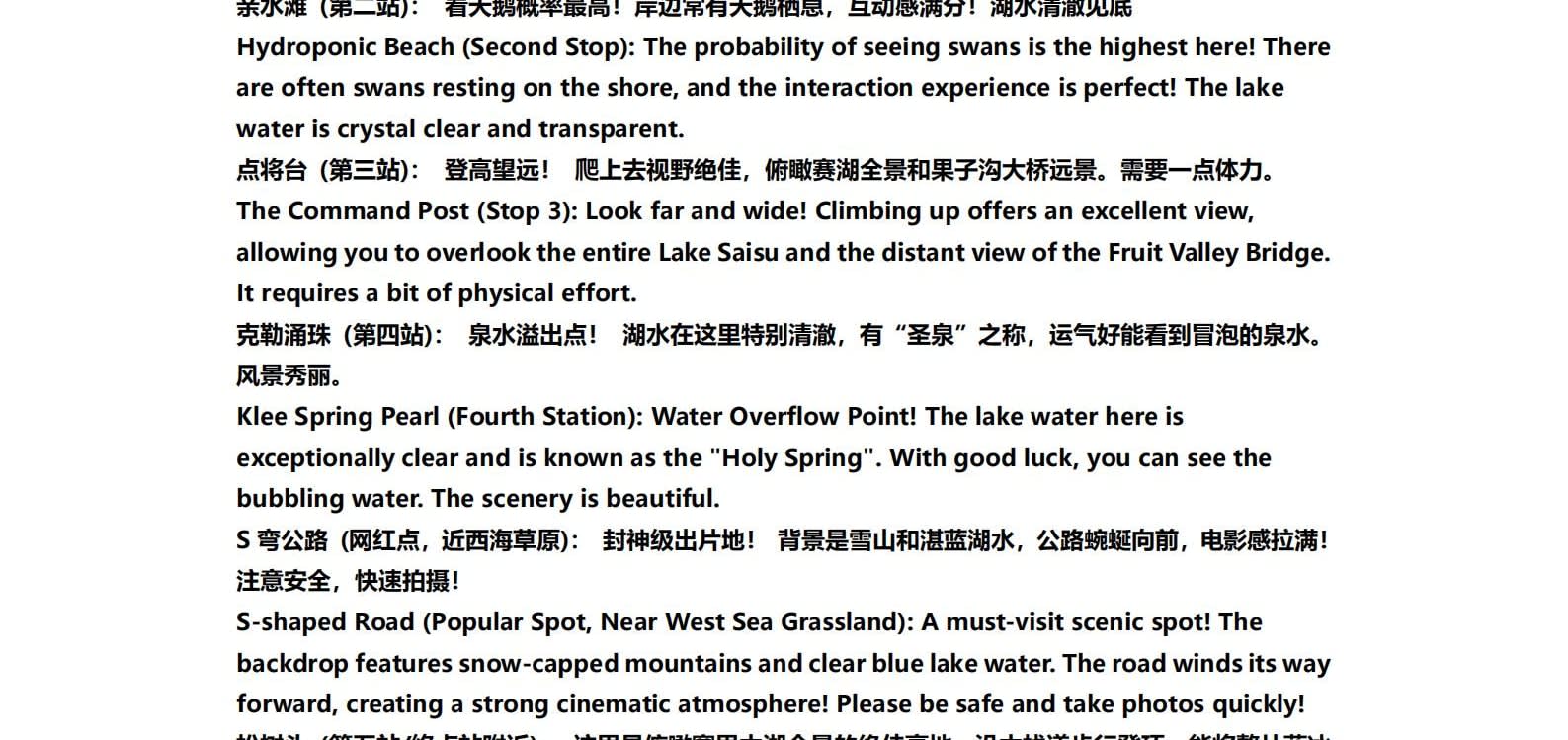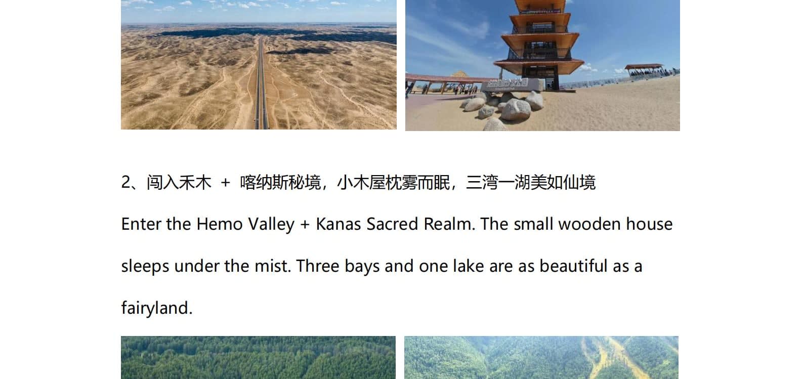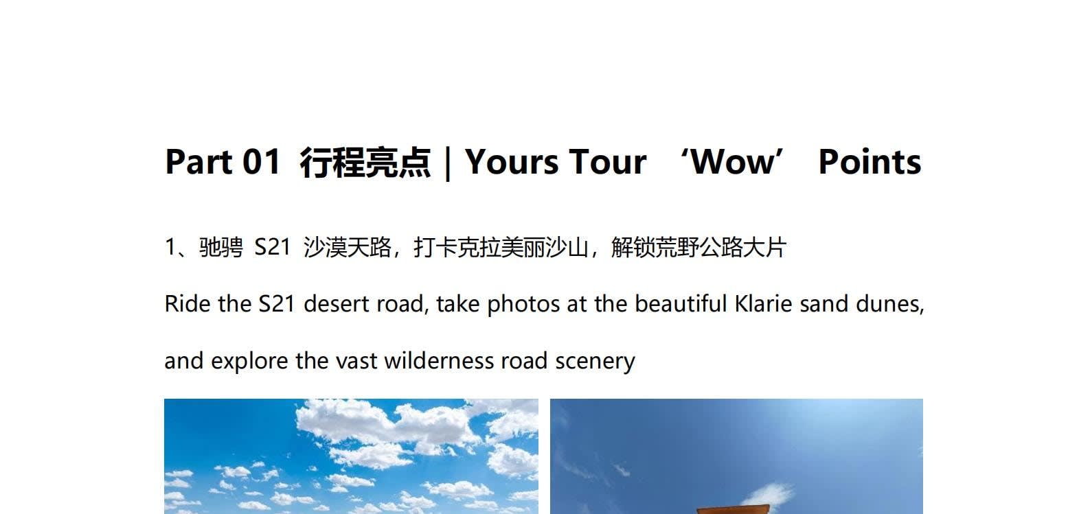 • 1일차: 우루무치 24시간 공항 픽업 서비스 2일차: 우루무치 - S21 사막 고속도로 - 카라마일리 사구 공원 - 알타이 3일차: 알타이 - 아허 고속도로 (개통 시 이용) - 허무촌 - 허무 통나무집 4일차: 호호트 - 호호트 마을 (신의 프라이빗 보호구역) - 카나스 호수 - 카나스 캐빈 5일차: 카나스 (우롱만 - 문베이 - 이모탈 베이) - 컬러풀 비치 - 우얼허 6일차: 우얼허 - 세계 악마의 도시 - 사이람 호수 풍경구 입구 7일차: 사이람 호수 일주 - 나랏 8일차: 나랏 - 나랏 하늘 초원 - 징허 9일차: 징허 - 무타하르 사막 - 우루무치 10일차: 우루무치 24시간 공항 픽업 서비스