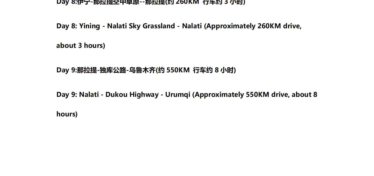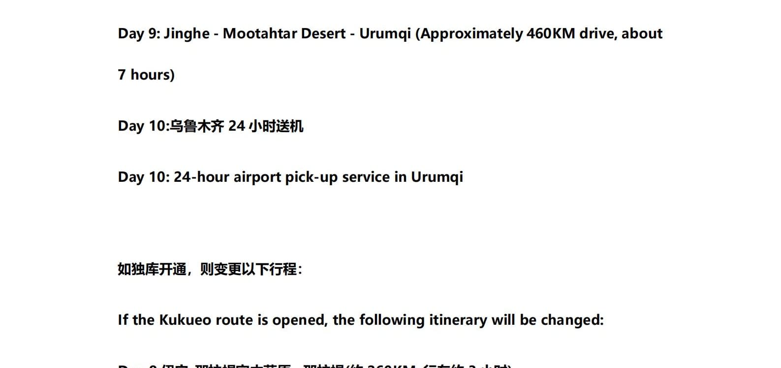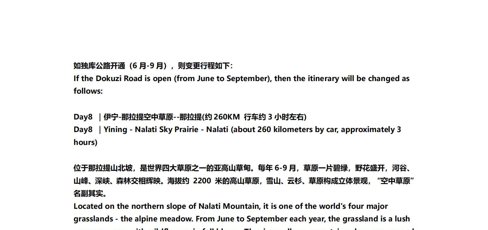 • 쿠쿠에오 노선이 개통되면 다음 일정이 변경됩니다: 8일차: 이닝 - 나랏 하늘 초원 - 나랏 9일차: 나랏 - 두커우 고속도로 - 우루무치