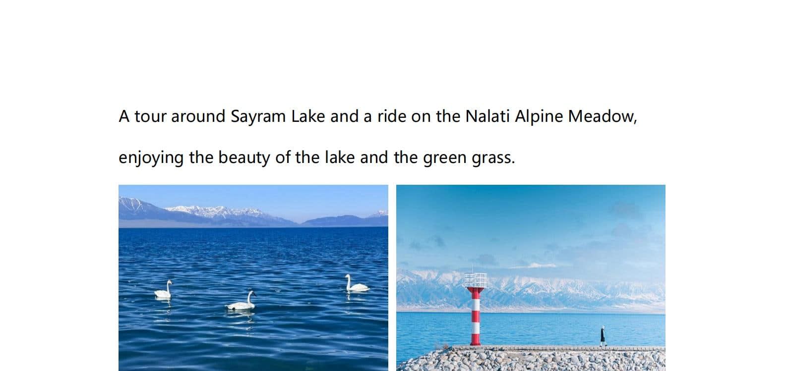 * 사이람 호수 주변을 둘러보고 나랏티 고산 초원에서 호수와 푸른 잔디의 아름다움을 만끽합니다.