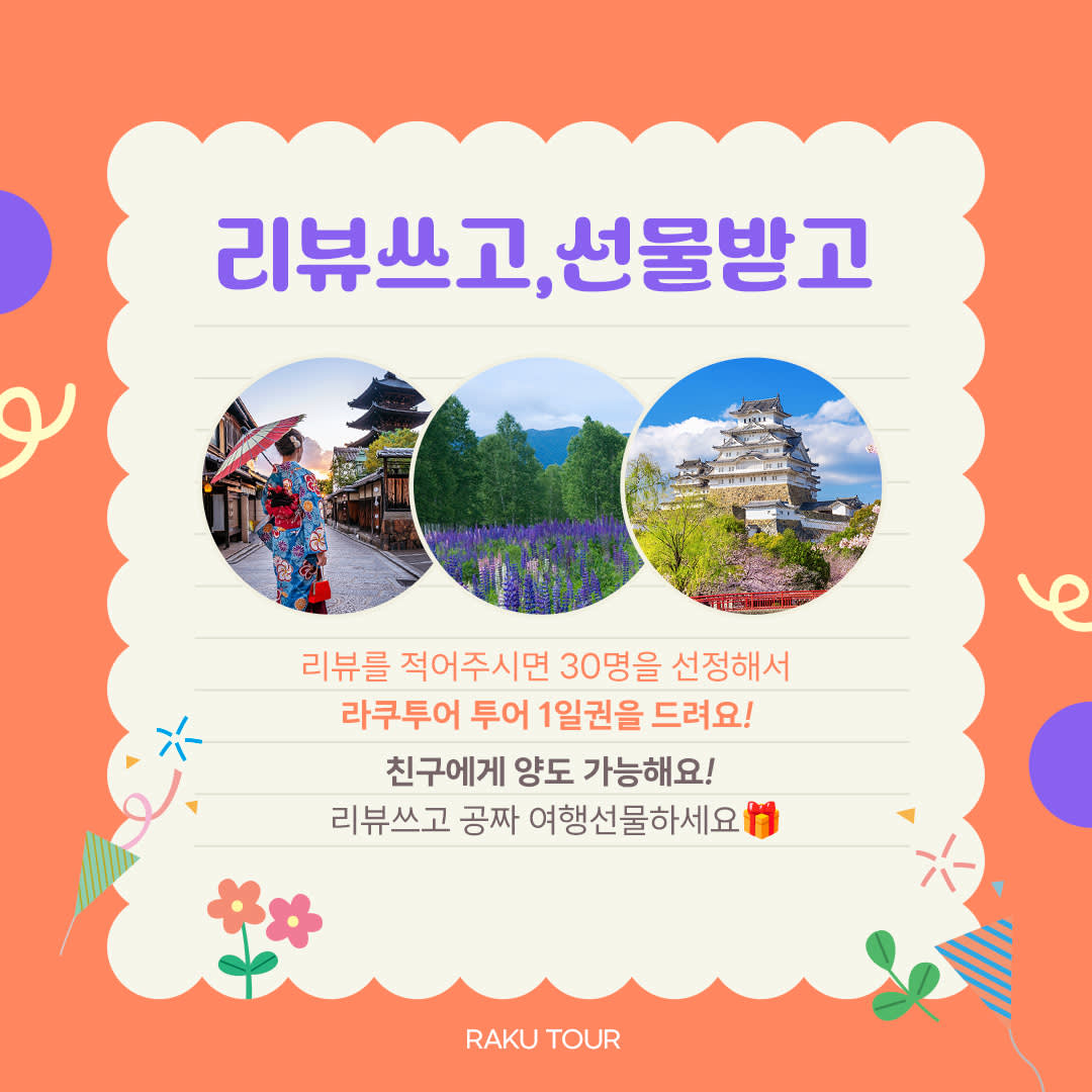 ❗️꼭 확인해주세요❗️ - 구매 시 대기 예약으로, 확정 안내는 조금만 기다려주세요. 순차적으로 예약 진행과 문의 답변 도와드리겠습니다! - 예약 확정이 되면 1~2일 내로 확정 알림과 메세지가 갑니다. 투어 당일에는 버스 탑승 전 가이드에게 예약자 성함 말씀해 주시면 됩니다. 따로 바우처는 보내드리고 있지 않습니다. 참고 부탁드립니다. - 출발 시간은 8시 입니다. ** 7시 40분부터 버스 탑승이 가능하오니, 시간 맞춰 미팅 부탁드립니다. - 투어 당일 개인 사정으로 인하여 승차를 못하셨을 경우, 별도 연락을 드리지 않으며 노쇼로 처리됩니다. - 예약 주신 투어는 날짜 착오, 단순 변심, 일정 변경, 지각, 노쇼 모두 환불 규정에 따라 처리되는 점 참고 부탁드립니다. - 최소 모객인원(10명) 미만 모객 시 투어가 취소될 수 있습니다. 확정 후에도 모객 미충족&버스문제로 인해 변경 또는 취소가 될 수 있는 점 양해 부탁 드립니다. - 전 좌석 *선착순으로 배정되며, 처음 앉으신 좌석이 지정석이라고 생각하시고 투어 진행하시면 됩니다. 맨 앞 좌석은 가이드님의 원활한 투어 진행을 위해 꼭 비워주셔야 합니다. - 미팅시간 꼭 맞추어 오시는 것을 추천 드립니다. 단독 투어가 아니기 때문에 일행 분과 떨어져 앉을 수 있는 점 미리 참고해주세요. - 라쿠투어는? 라쿠투어 소속 베테랑 한국인 가이드와 함께하는 투어입니다. 여행자분들의 안전한 투어를 위해 여행보증보험에 가입되어있습니다. 투어 보험 외에 개인의 여행자 보험을 가입하시고 해외 여행하시는 것을 추천 드립니다. - 하루 만에 돌아보기 벅찬 지역을 최상급의 쾌적한 버스를 이용하여 하루만에 투어 가능합니다. 무리하게 진행하지 않으며, 충분한 휴식과 자유 시간을 드립니다. - 요금은 소인&성인 동일하게 구매해주시면 됩니다. - 24개월 이하의 영아는 장시간 투어 & 안전 상 의 이유로 투어가 불가합니다. 사전에 고지 없이 탑승할 시 중도 하차할 수 있는 점 꼭!! 유의해 주시기 바랍니다. - 어린 아기, 어린 자녀들이 장시간 투어로 울거나 보채는 경우가 많습니다. 단체로 이용하는 투어라 아이의 컨디션 조절과 케어 잘 부탁 드립니다. 임산부, 고령자의 경우 투어 특성 상(장거리, 안전 상) 예약하시기 전에 사전에 미리 꼭! 말씀해 주시고 예약해 주셔야 합니다. 다른 고객들에게 피해가 지속될 경우에는 중도 하차할 수 있는 점은 양해 부탁 드립니다. - 개인 전자기기는 이어폰을 반드시 사용하여 이용 부탁 드립니다. 단체로 진행되는 1일 버스 투어로 타인에게 불편함을 주지 말아 주십시오. - 주최 측의 판단으로 투어 진행 부적격 판단 시 임의 하차 진행할 수 있습니다. 매너 있는 투어로 더욱 즐겁고 알찬 여행이 되시길 바랍니다. - 캐리어, 유모차 가져오실 경우 사전에 미리 말씀해 주셔야 가능합니다. 파손 및 분실 시 도움을 드리기 어렵습니다. - 실시간 현지의 교통 상황과 기상 상황에 따라 일정과 시간이 변경될 수 있는 점 양해 부탁 드립니다. - 고객과 소통을 최우선으로 합니다. 업무 시간 내에는 빠르게 응답해 드립니다. - 직원에게 폭언&욕설을 하시는 분은 산업안전보건법에 의해 처벌 대상이 됩니다. 모든 직원에게 폭언&욕설을 삼가주시기 바랍니다. - 문의는 트리플 메시지, 카카오톡 플러스친구 라쿠투어 메시지로 문의 부탁드립니다.