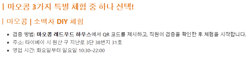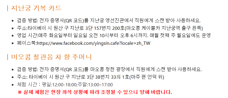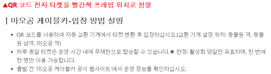 첫 사용일로부터 14일 이내에 모든 사용을 완료해 주세요. |타이베이시립 동물원 QR 코드를 입구 기계에 스캔하여 입장하십시오. |마오콩 곤돌라 동물원역, 동물원 남역, 마오콩역에서 작동 발권기를 통해 종이 티켓을 교환하여 사용하십시오. |동물원 셔틀 열차 (편도) (선택 시) 동물원 정문과 동물원 남역에서 직원에게 바우처를 제시 후 탑승해 주십시오. |마오콩 3가지 체험 QR 코드를 제시 후 사용하십시오.