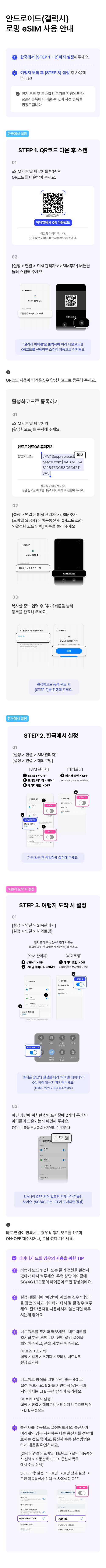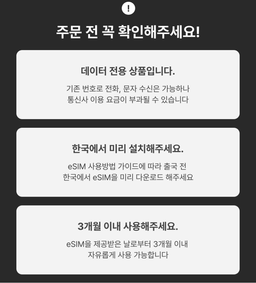 · 이 상품은 바우처(QR 코드)가 발송되기까지 최대 10~15분 정도 소요될 수 있습니다. · 구매 즉시 QR코드를 발급해 드리기 때문에, 상품 구매 후 '환불 불가' 입니다. · 데이터 전용 상품으로, 기존 번호로 전화나 문자 수신은 가능하지만 통신 요금이 부과될 수 있습니다. · 한국에서 미리 설치해 주세요. eSIM 사용 가이드에 따라 출국 전 한국에서 eSIM을 미리 받아주세요. · 3개월 이내 사용해 주세요. eSIM을 제공받는 날로부터 3개월 이내 자유롭게 사용 가능합니다.
