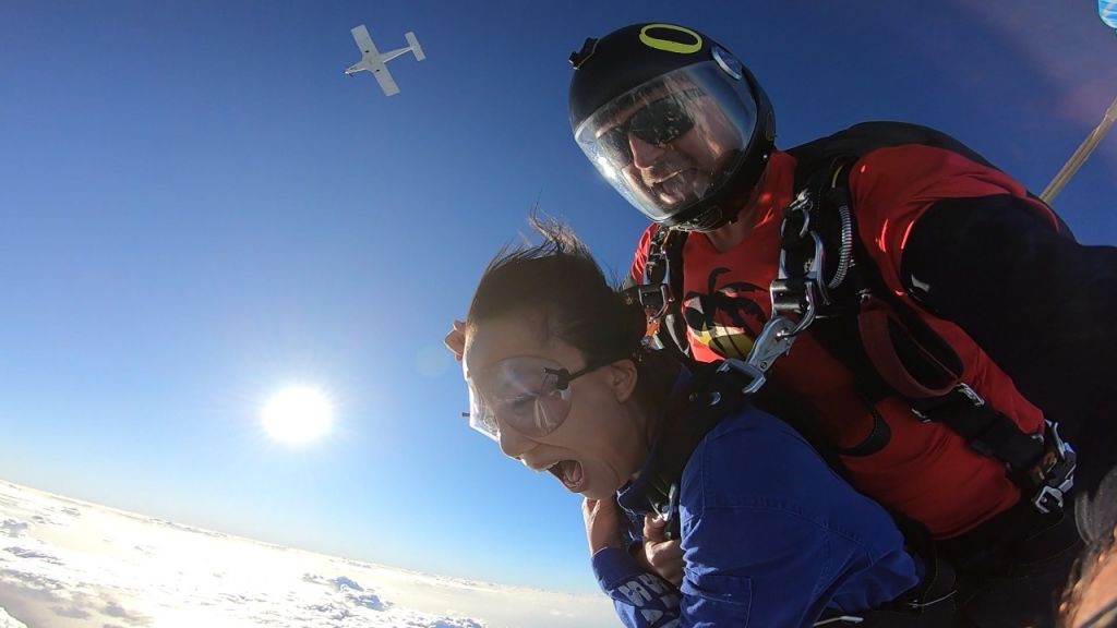 지정된 높이에 다다르면, 담당 강사의 가이드에 따라 기체 밖으로 뛰어내릴 준비 합니다. 뛰어내리기 전 올바른 자세를 (팔을 가슴위치에서 X자로) 잡아주세요. 마지막으로 스카이 다이빙의 시작을 알리는 점프!