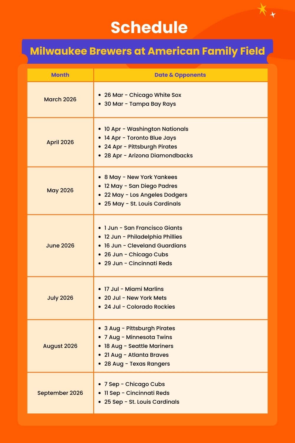 * 시즌 내내 아메리칸 패밀리 필드에서 열리는 밀워키 브루어스 야구 경기 날짜를 선택하세요.