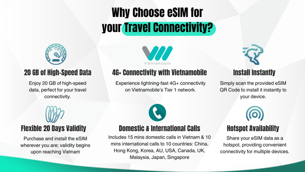 베트남에서 끊김 없는 인터넷 접속과 빠른 현지 데이터를 위한 eSIM의 편리함을 경험하세요. eSIM 호환 장치에 Airhub 앱을 다운로드하기만 하면 실제 SIM 카드 없이도 원활한 연결을 즐길 수 있습니다. 여행 중에도 친구 및 가족과 연결 상태를 유지하여 어디를 가든 항상 연락할 수 있습니다.