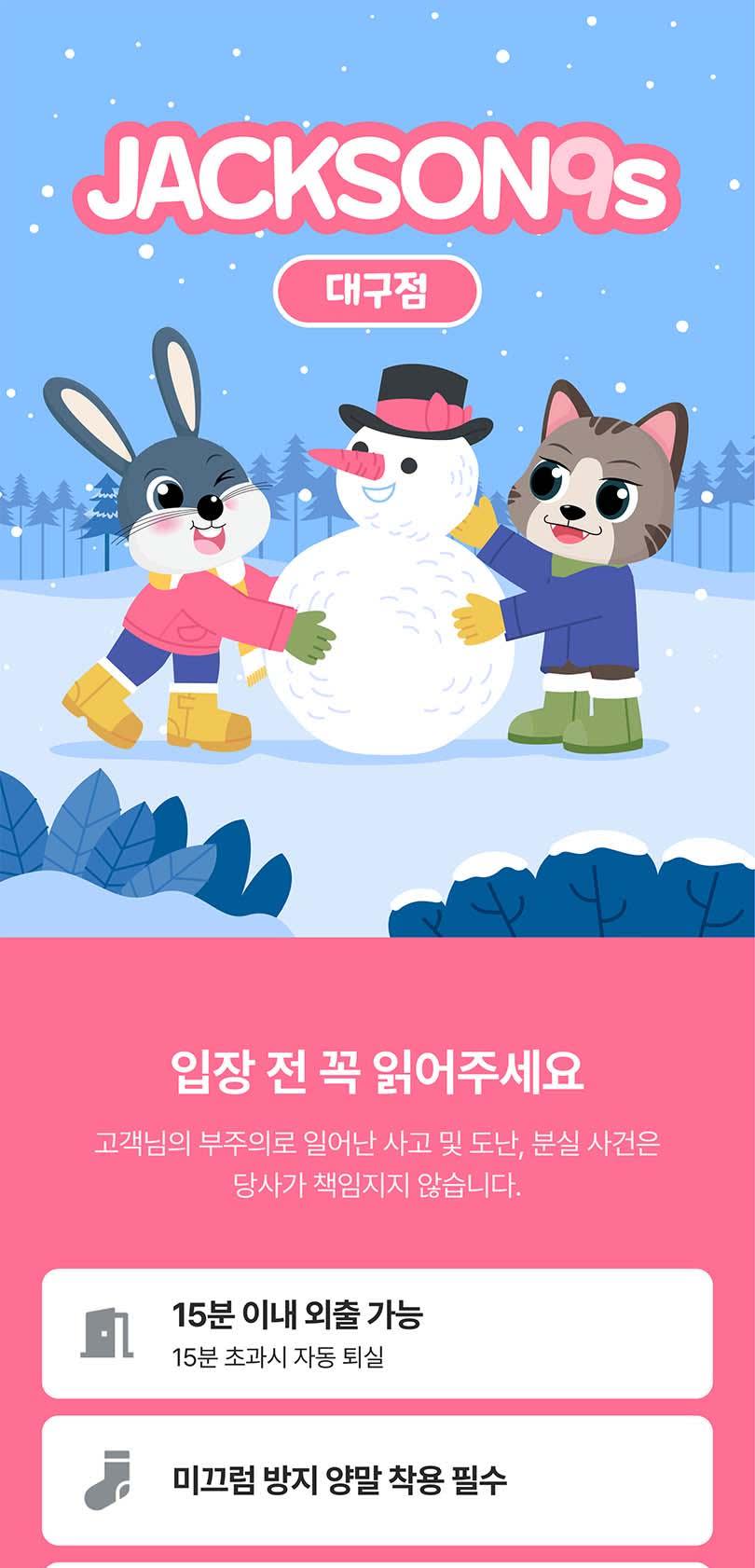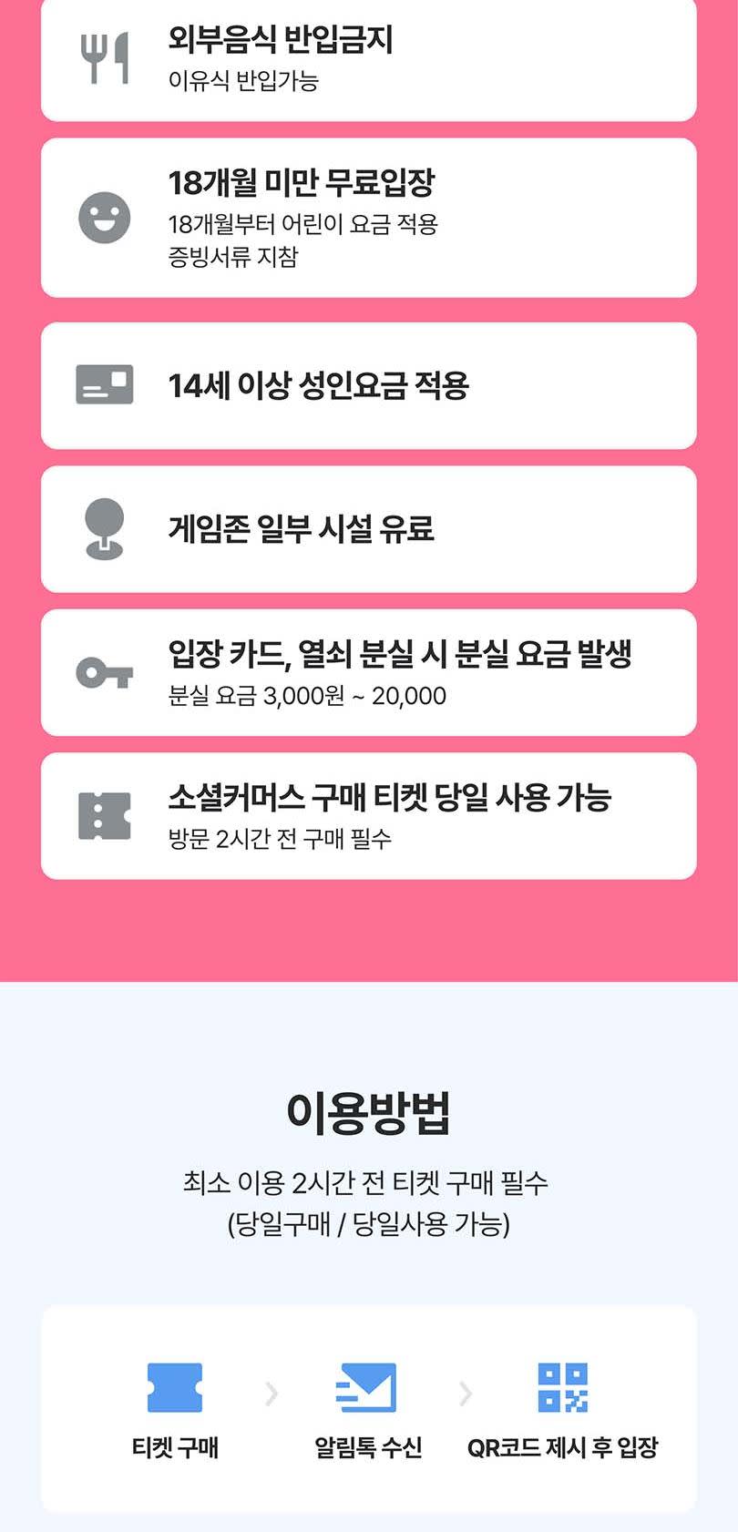 [이용 정보] * 판매기간 : ~ 2026.03.31 * 유효기간 : 2026.01.01 ~ 2026.03.31 [사용 방법] * 안심번호 설정 시 주문확인이 어려울 수 있어 구매 시 실제 휴대폰 번호로 설정 부탁드립니다. * 겨울방학기간 : 25.12.29~26.02.28 *입장객(어린이,성인포함) 미끄럼 방지 양말 필수 착용 / 별도 구매 가능 *다자녀혜택 이벤트: 다자녀 가족중에서 셋째자녀(초등6학년까지) 무료입장 *증빙서류:가족관계증명서 또는 주민등록등본 첨부 *초등학교 3학년미만 보호자없이 입장불가 *최소 이용 2시간 전 티켓 구매 필수 -(당일 구매 / 당일 사용 가능) *본 티켓은 현장에서 지류 입장권으로 교환하여 사용 가능합니다.