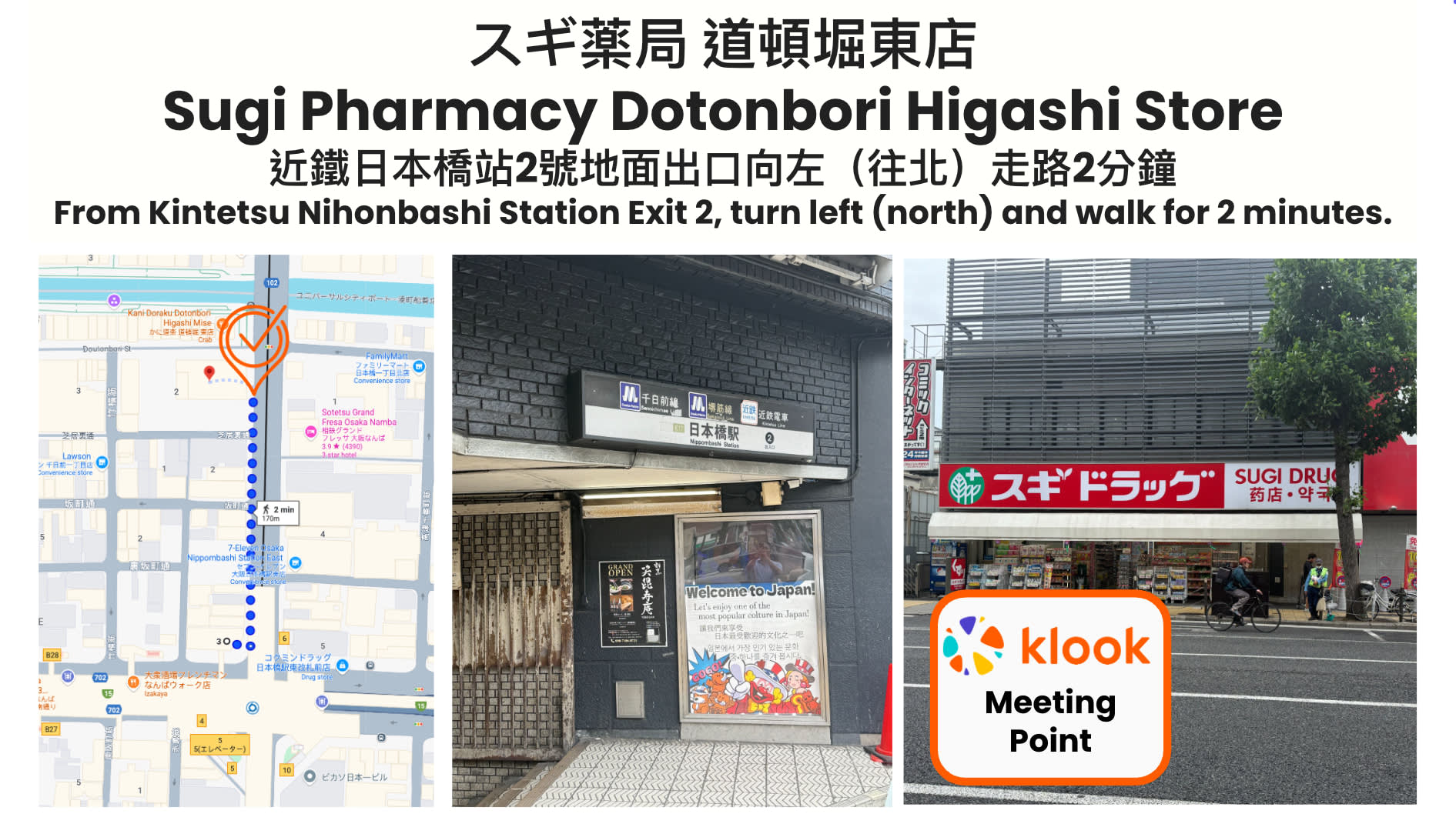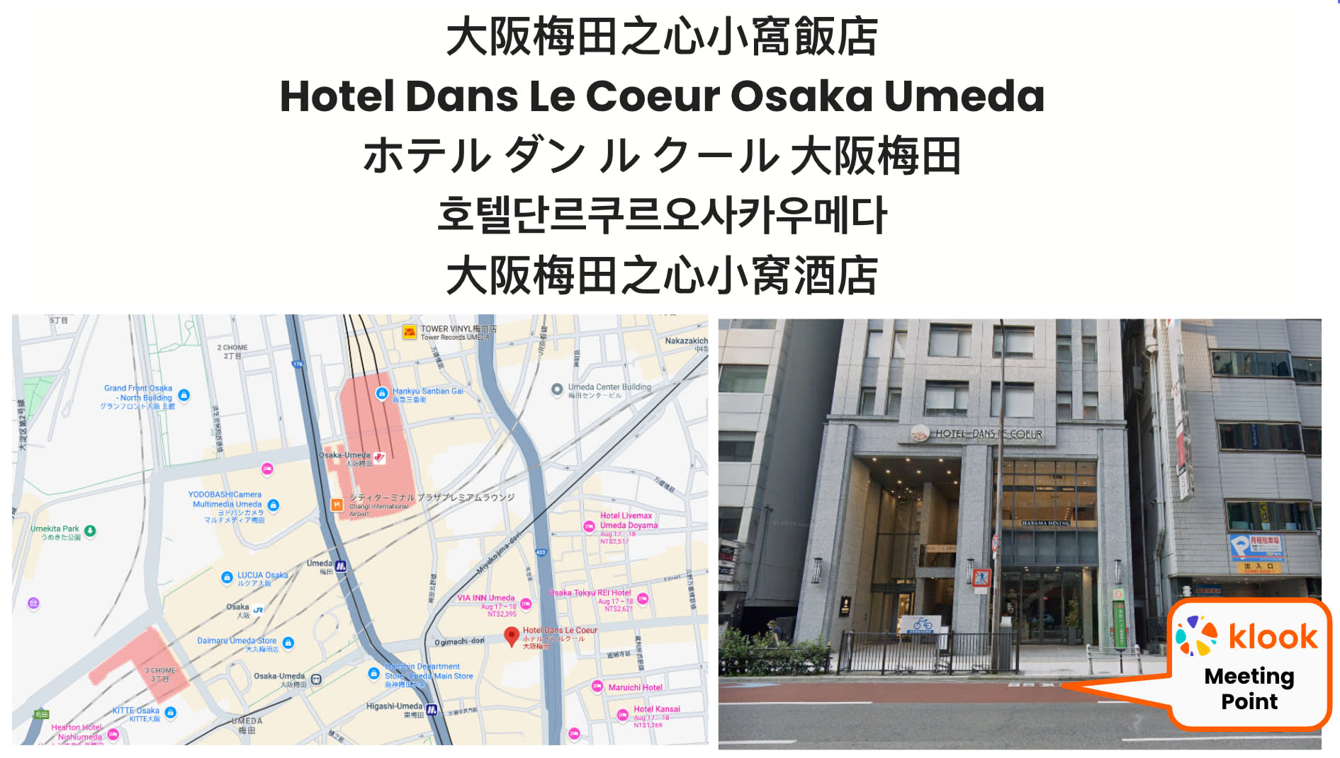 • 난바/니혼바시(도톤보리) 및 우메다(오사카역)에서 매일 출발하며, 고정된 미팅 장소와 시간이 있습니다. 자세한 내용은 선택한 패키지를 참조하세요.