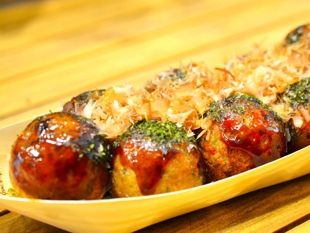 타코야끼는 철판의 둥근 구멍에 물과 계란으로 만든 밀가루 반죽을 부은 후, 그 안에 잘라 놓은 문어를 넣고 동그랗게 구워냅니다. 완성된 타코야끼는 접시에 담아 맛있게 즐길 수 있습니다. 가쓰오부시, 아오노리, 소스, 마요네즈 등을 찍어 먹는 것이 타코야끼의 기본 스타일입니다. 타코야끼는 겉은 바삭하고, 속은 푹신한 절묘한 식감! 맥주와도 잘 어울립니다.